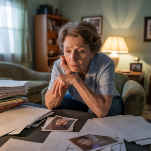Sara sat on a small concrete bench bordering the park, her gaze lost somewhere in the gray afternoon as she hugged her arms…