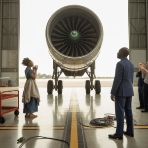 Inside the hanger at Lagos airport, a silent crowd of engineers circled a giant silver jet engine resting on a wheeled stand. Red…