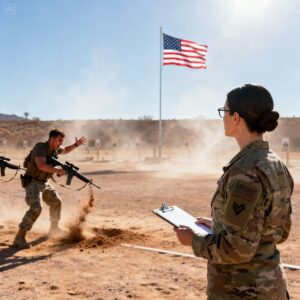 Part 1: The Nevada sun didn’t just shine; it hammered against the earth, turning the firing range into a convection oven of shimmering…