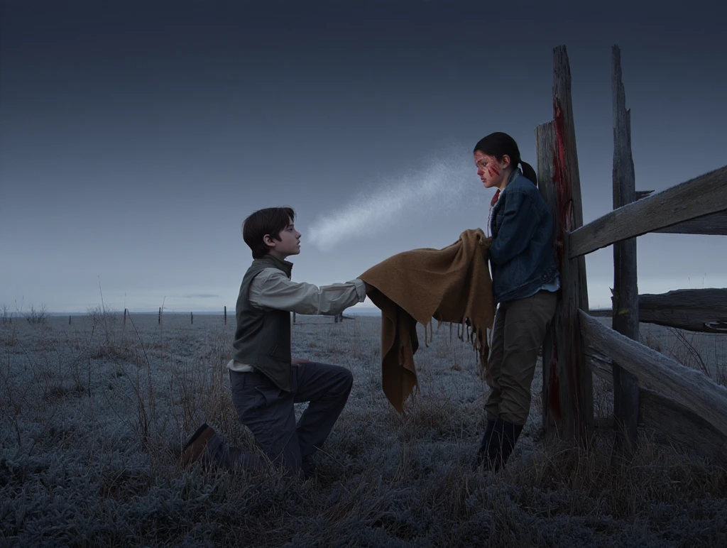 The frost had melted since dawn, and the sky stayed low all day, pressing like a hand over the prairie. Liam Carter, thin for 14, and quieter than most, stepped down from the porch without a coat, the porch boards moaning underfoot, his breath fogged and vanished as soon as it left his mouth. In his arms he carried the patchwork blanket stitched by his grandmother.