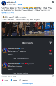 If the WNBA expected the fine to chasten its biggest star, they were sorely mistaken. Clark’s response was immediate, public, and dripping with sarcasm. Taking to her own social media, she announced the fine to her massive following and, rather than apologizing, she doubled down. “BENCH MOB WILL BE EVEN MORE ROWDY TOMORROW LETS GOO!!!!!!!!!!!!!,” she wrote, turning the league’s disciplinary measure into a badge of honor and a promise of continued passion from the sidelines.