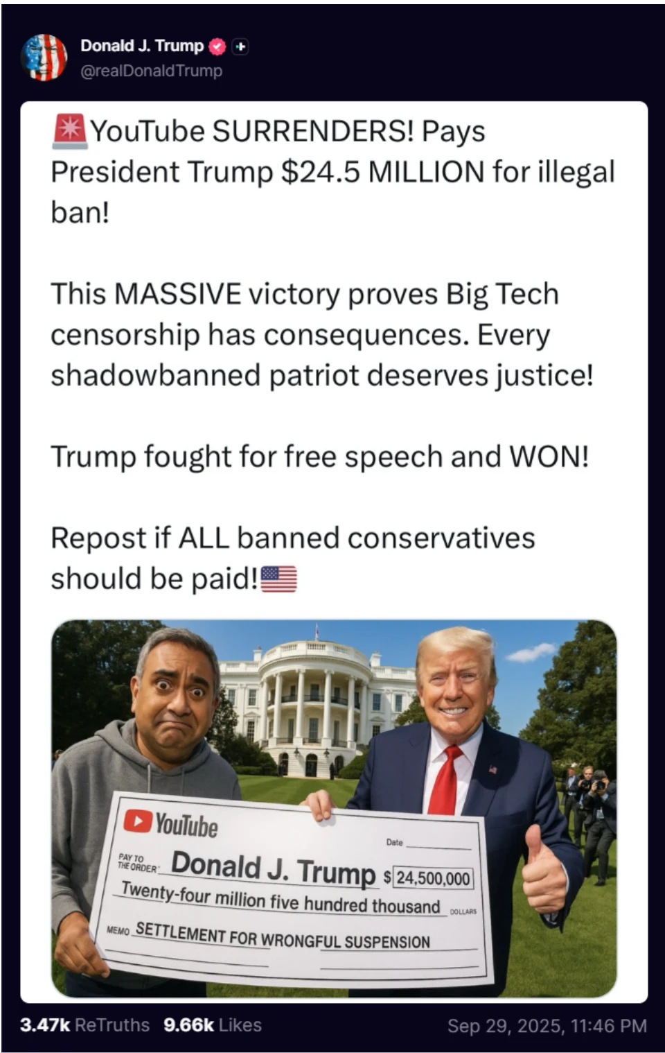 Late on a Monday evening, Donald Trump’s Truth Social account lit up with an image designed to convey total surrender by his opponent. The meme showed a man in a gray hoodie, presumably representing a chagrined tech executive like YouTube CEO Neal Mohan, sheepishly holding one end of an oversized novelty check. On the other end, a grinning Trump gives a confident thumbs-up. The check, made out to “Donald J. Trump” for the sum of “$24.5 million”, included a pointed memo line: “Settlement for Wrongful Suspension.”