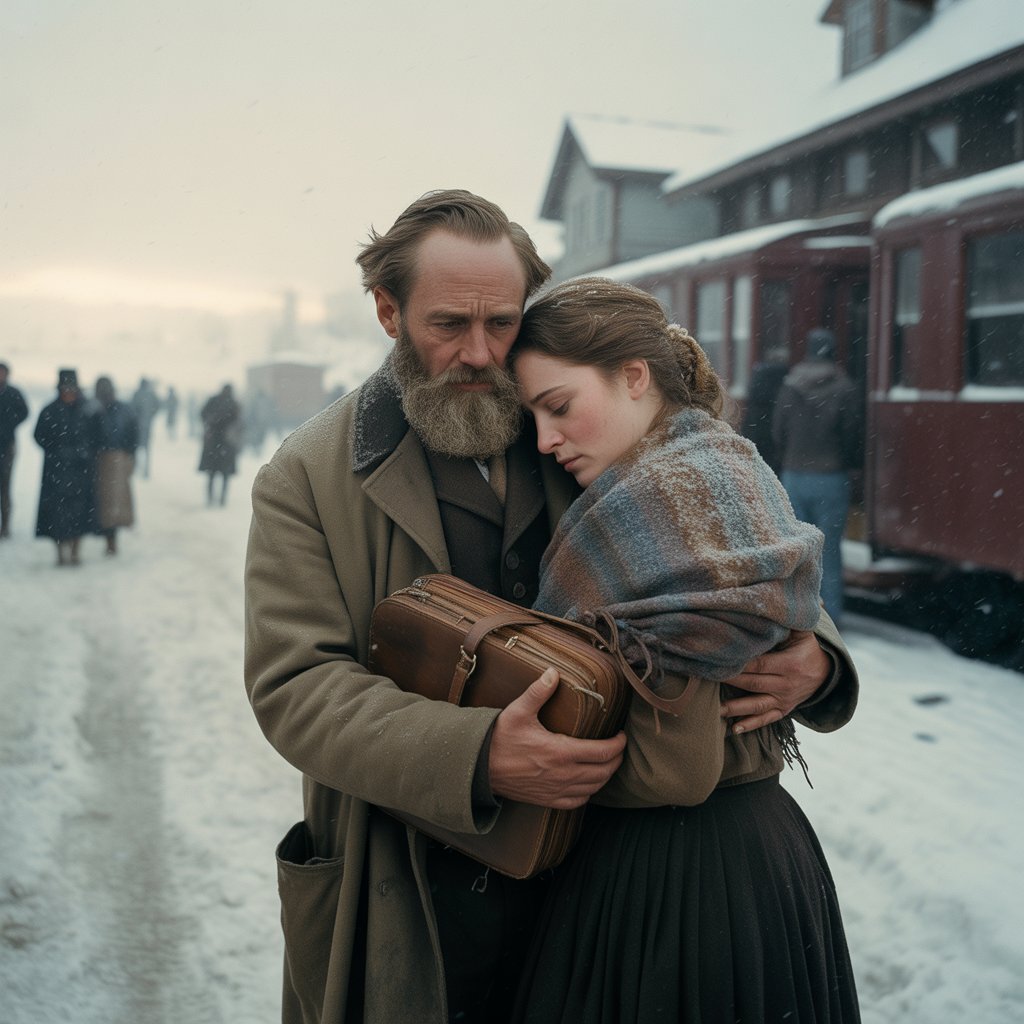At first, it looked like a bundle of discarded cloth. Then it shifted, and a pale face turned toward him. It was a woman, young but without the softness of fragility. Her lips were chapped, and her eyes held the wide, hollowed look that comes when the cold carves its way into the soul. In her lap, she clutched a leather satchel, its strap frozen solid. Her fingers were locked around it as if it held the last treasure on earth.