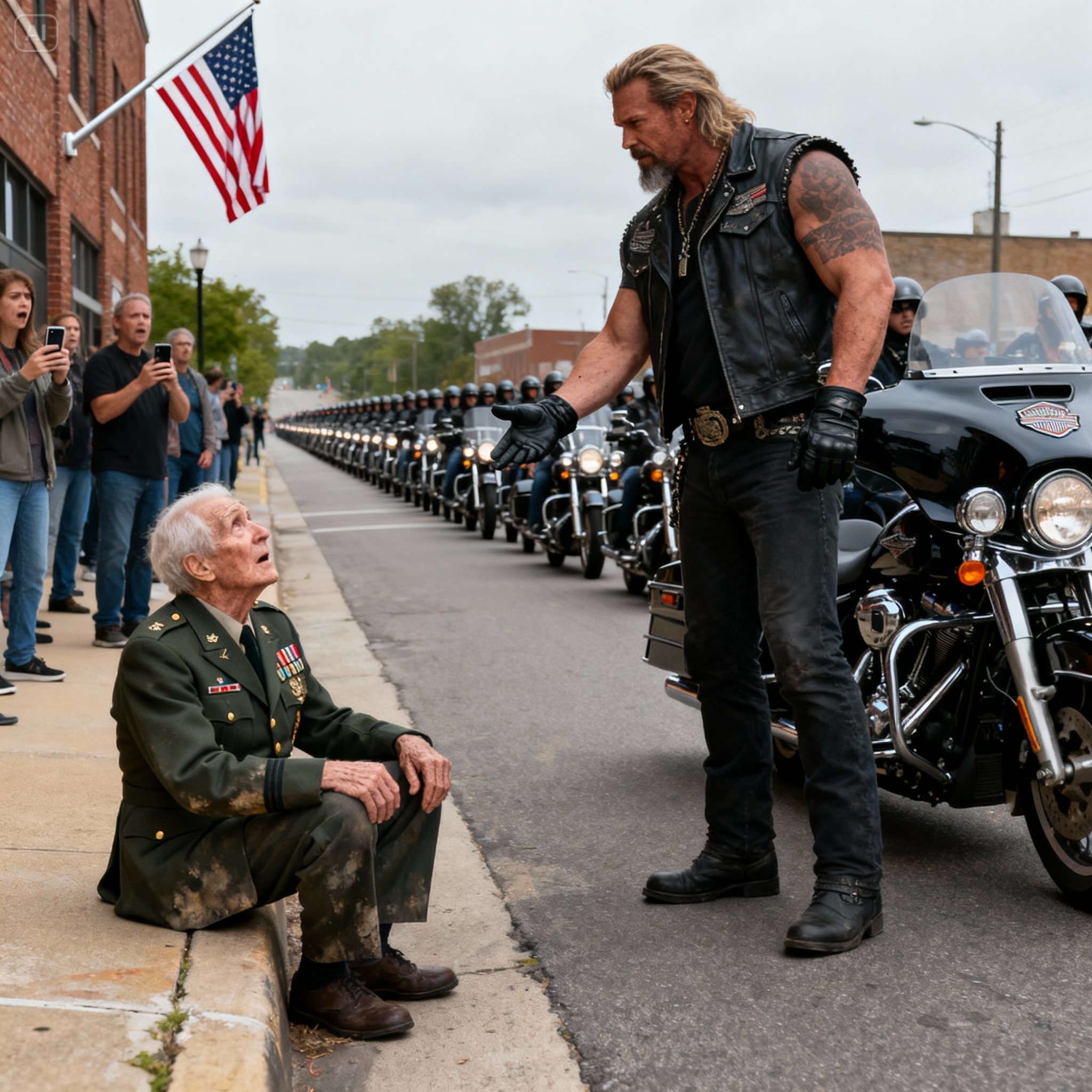 At the very front rode Blaze, his eyes locked on the old man sitting on the curb. He raised a gloved hand, and the wave of motorcycles slowed to a crawl, pulling up in front of Ellis with perfect, synchronized precision.