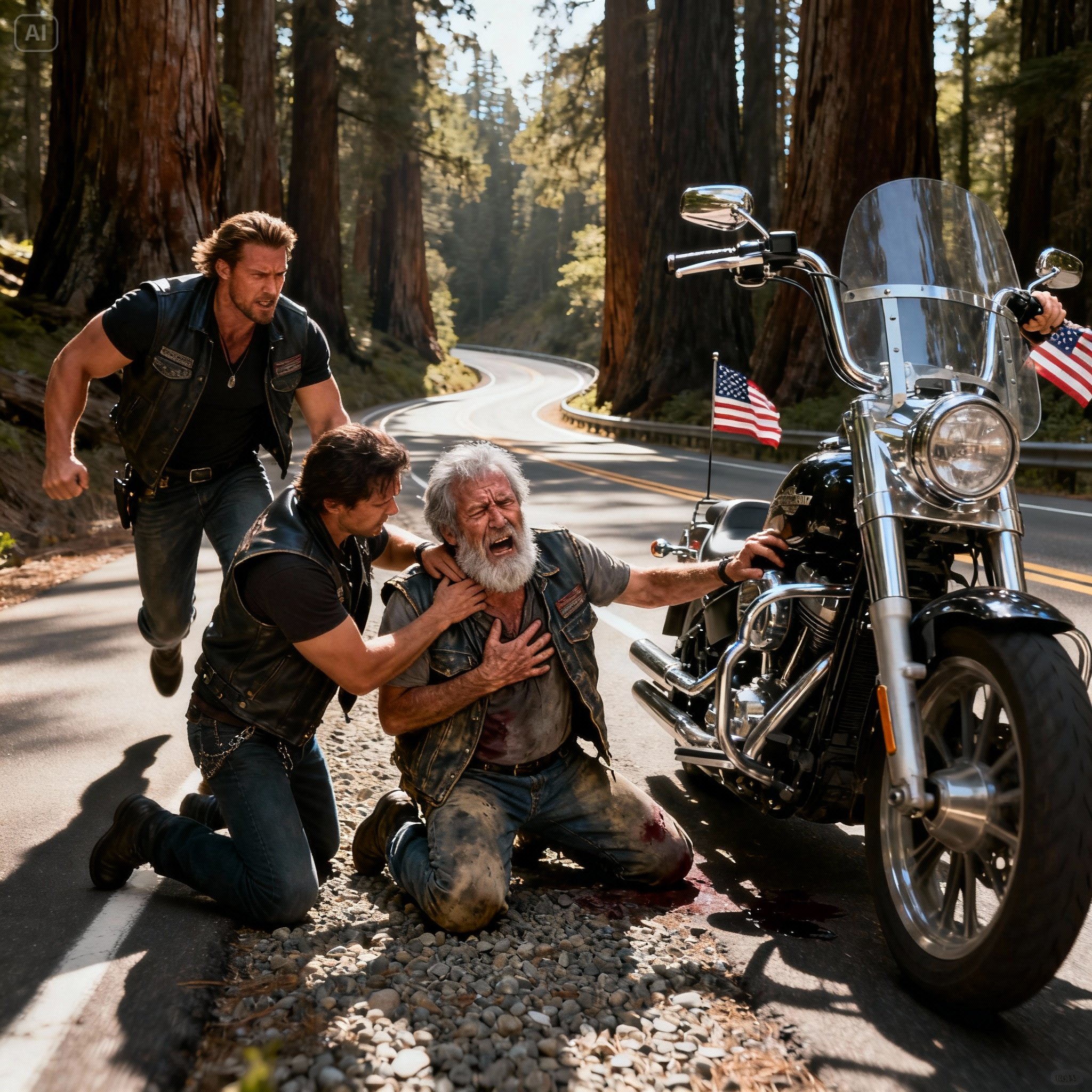 On a winding road where redwood shadows fall like old regrets, one man’s failing heart was answered by a tide of chrome and leather—awakening a promise that thunder itself had sworn to keep, and proving that the deepest loyalties are forged not in silence, but in the roar.
