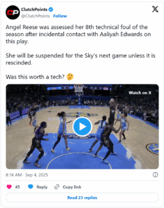 It happened in the third quarter of a tight game, the kind of high-pressure environment where emotions naturally run hot. After being called for a personal foul, Reese reacted to the whistle. What followed was a brief but critical interaction with the game official. Seconds later, the referee made the signal: a technical foul. It was her second of the game, but more importantly, it was her eighth of the season. According to WNBA rules, a player who accumulates seven technical fouls receives a warning. The eighth triggers an automatic suspension for the team’s next game.