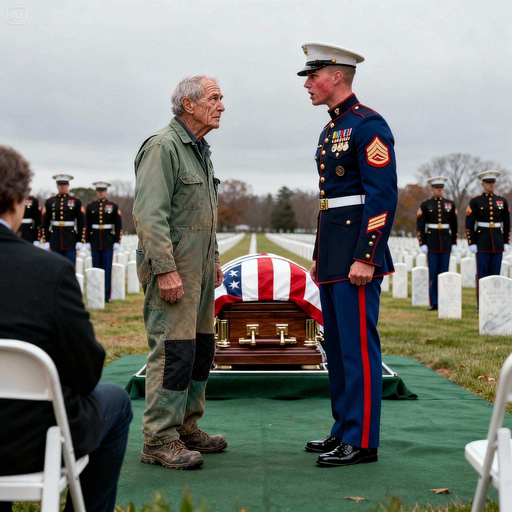 The chaplain stopped speaking, his mouth hanging slightly open, his words cut off mid-sentence. Every head turned. Two hundred mourners, their faces a mixture of confusion and shock, stared at the old groundskeeper in the faded green coveralls.