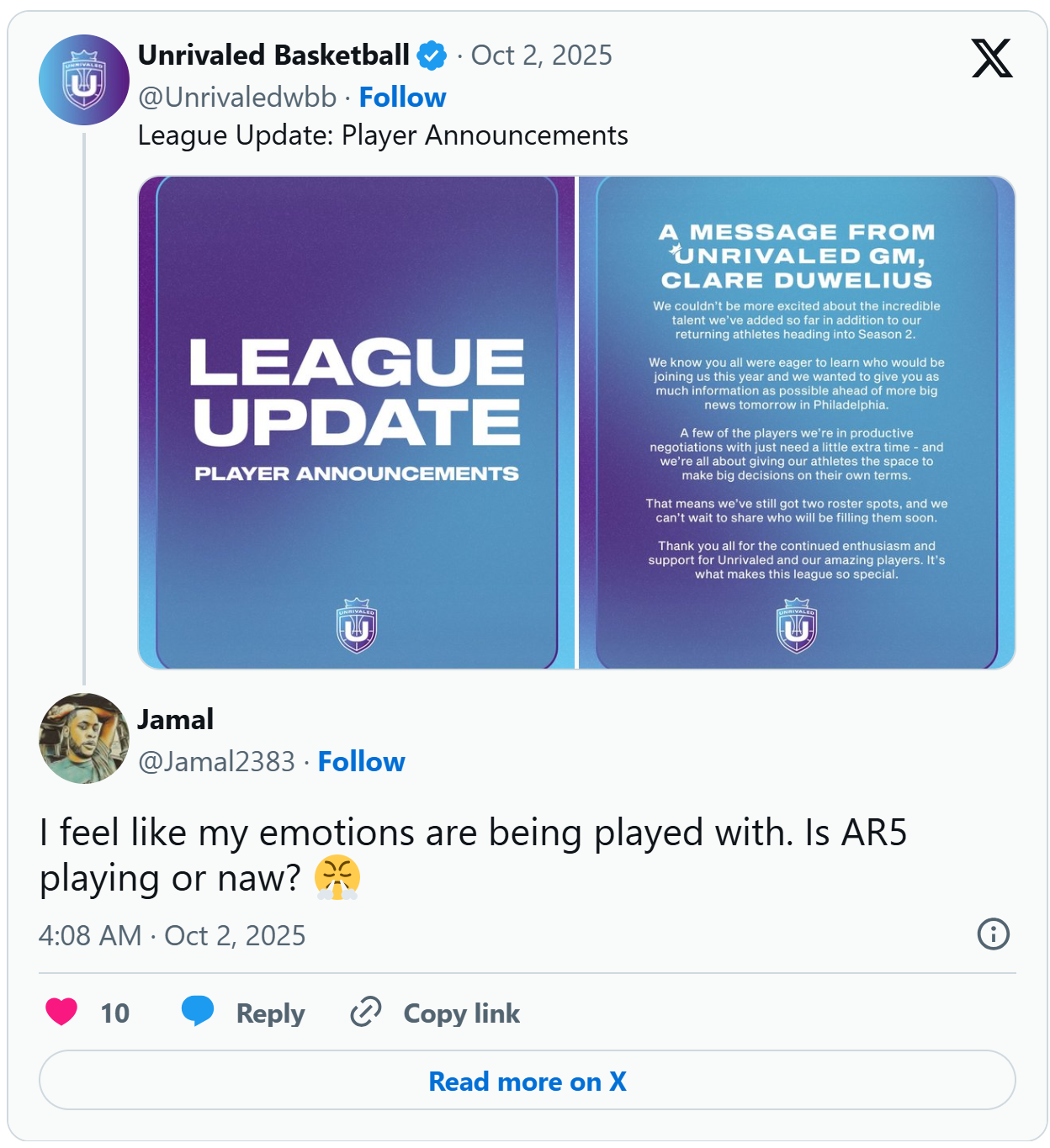 The front office at Unrivaled has clearly heard the clamor. In response to the growing unease, the league’s general manager, Clare Duwelius, issued a formal statement. While intended to be reassuring, it may have only fueled more speculation. “We couldn’t be more excited about the incredible talent we’ve added so far in addition to our returning athletes heading into Season 2,” the statement began. “A few of the players we’re in productive negotiations with just need a little extra time — and we’re all about giving our athletes the space to make big decisions on their own terms.”