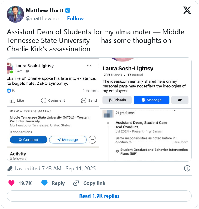 “An MTSU employee today offered inappropriate and callous comments on social media concerning the horrific and tragic murder of Charlie Kirk,” McPhee wrote in the statement.