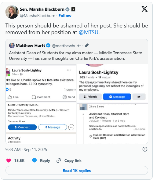 This incident is a powerful case study in the modern perils of being a public figure in the digital age. “This person should be ashamed of her post. She should be removed from her position at @MTSU,” Blackburn wrote on X. It reveals a new, unspoken contract between institutions and their employees: what you say online can and will be used against you, especially if you hold a position of influence. For Sosh-Lightsy, the consequences were immediate and final. But the debate continues, resonating through faculty lounges and boardrooms across the country. Where is the line? Should a university administrator be held to a higher standard of decorum than an average person? And what does it mean for an institution’s reputation when one of its leaders shows what the university itself called “a lack of empathy”?
