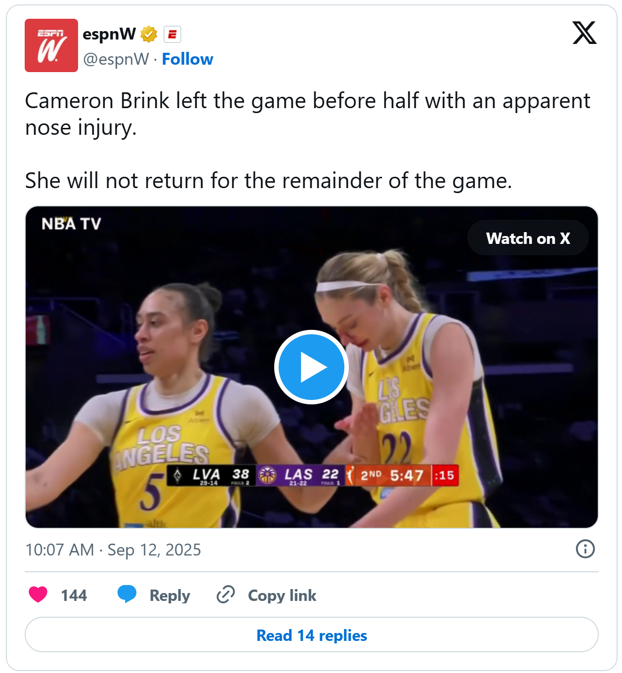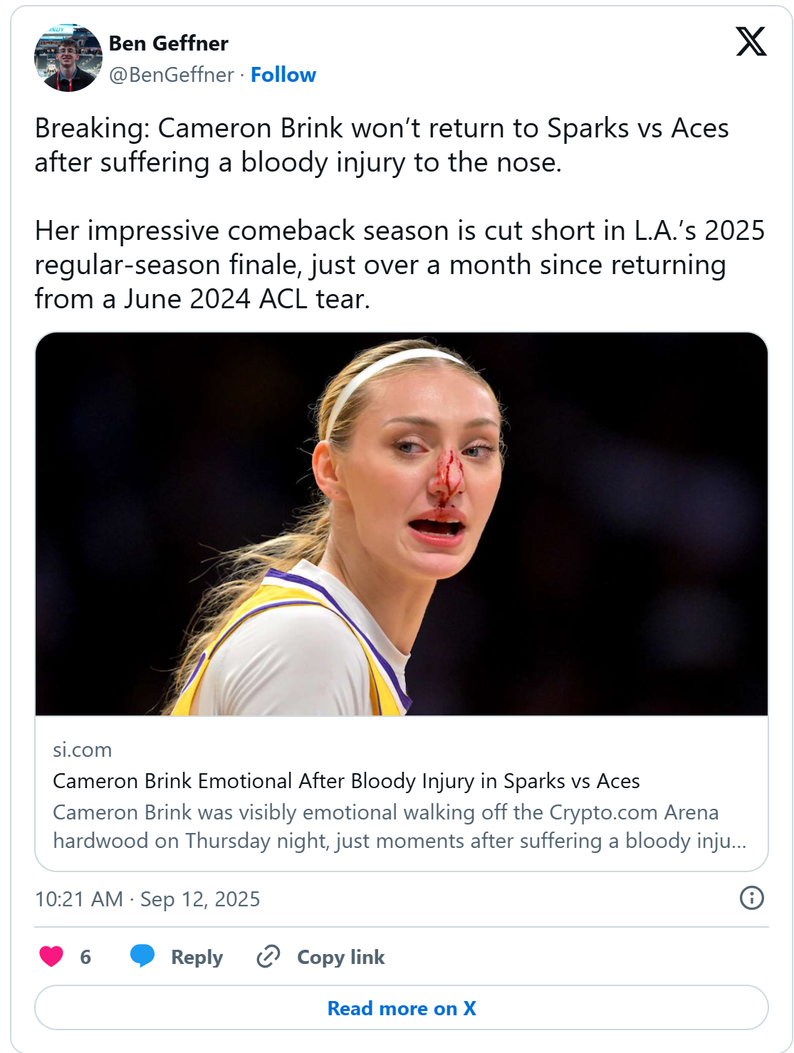 The final game of a grueling season is often a time for reflection, a moment to honor the fight put forth over dozens of contests. For the Los Angeles Sparks, their season finale against the Las Vegas Aces was precisely that—a chance to end on a high note despite their playoff hopes already being dashed. More significantly, it was another opportunity for forward Cameron Brink to continue her inspiring comeback. But in a cruel and sudden turn, her season of resilience was cut short. Midway through the second quarter, a routine play along the baseline became a scene of immediate concern. Brink was struck in the face, a blow that sent her from the game with a bloody nose. As her teammate Dearica Hamby helped her off the court, the crowd’s energy shifted from competitive excitement to somber worry. The official word confirmed what many feared: she was out for the remainder of the game. This unfortunate Cameron Brink injury was more than just a physical setback; it was an emotional gut punch that brought an abrupt and unfair end to a comeback story 13 months in the making.