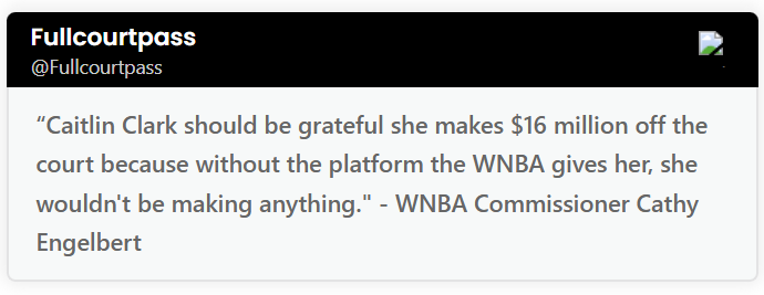 “Her response was, ‘Caitlin should be grateful she makes $16 million off the court because without the platform that the WNBA gives her, she wouldn’t make anything.’ And in that same conversation, she told me, ‘Players should be on their knees thanking their lucky stars for the media rights deal that I got them.’ That’s the mentality driving our league from the top.”