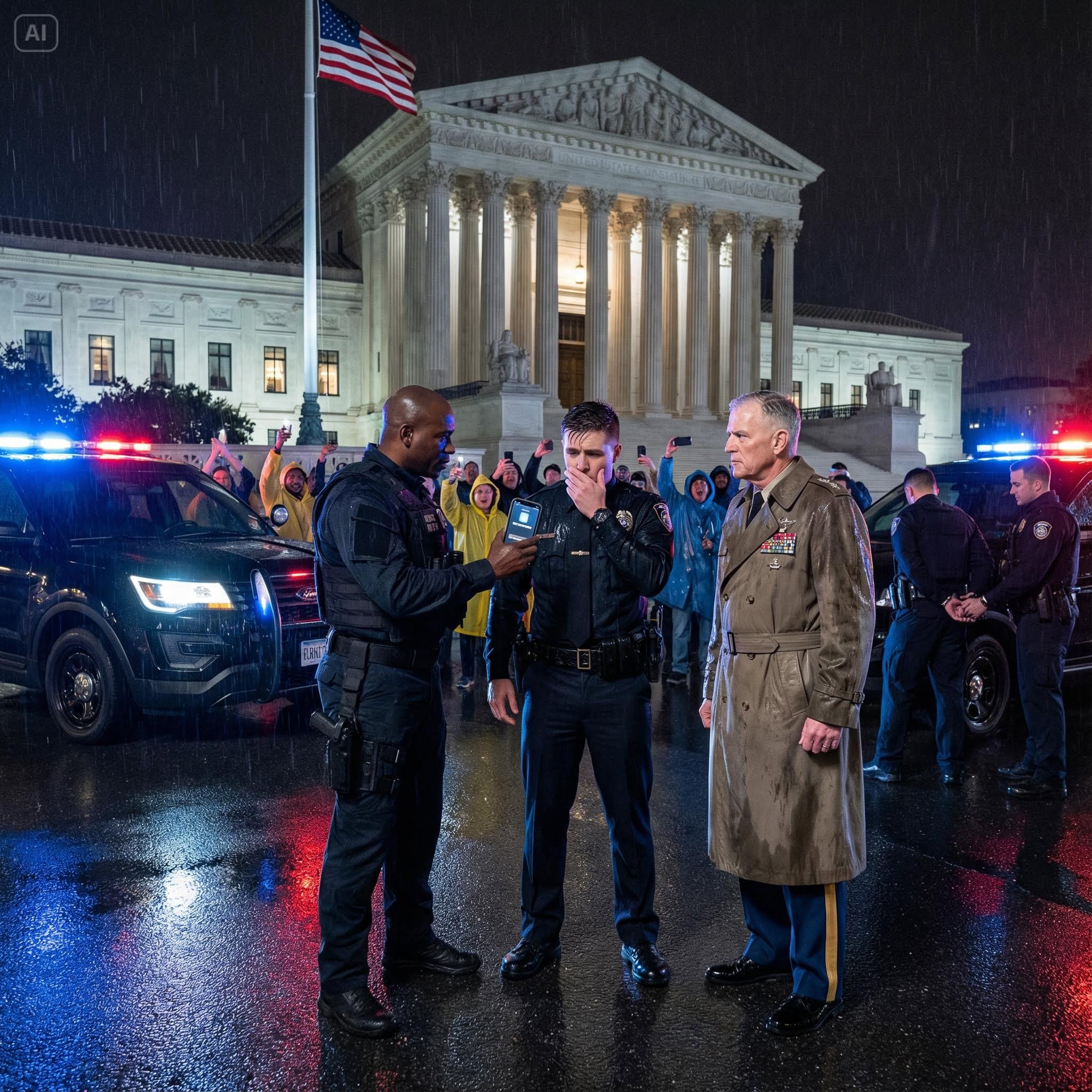 The crowd was a mix of supporters, rubberneckers, and social media vultures, phones held high. I walked slowly, with a deliberate, firm cadence, ignoring the wet asphalt and the gawkers. But right at the entrance, a line of police officers blocked my path.
