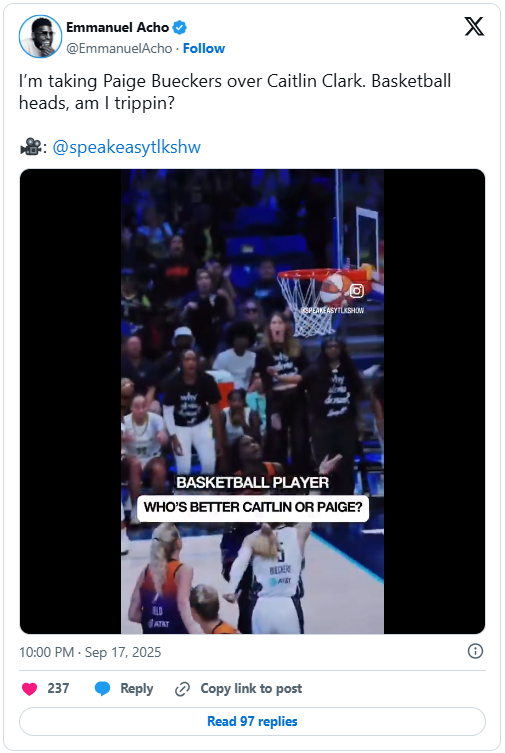 “I’m taking Paige Bueckers over Caitlin Clark. Basketball heads, am I trippin?” Acho captioned his nearly minute-long video on X