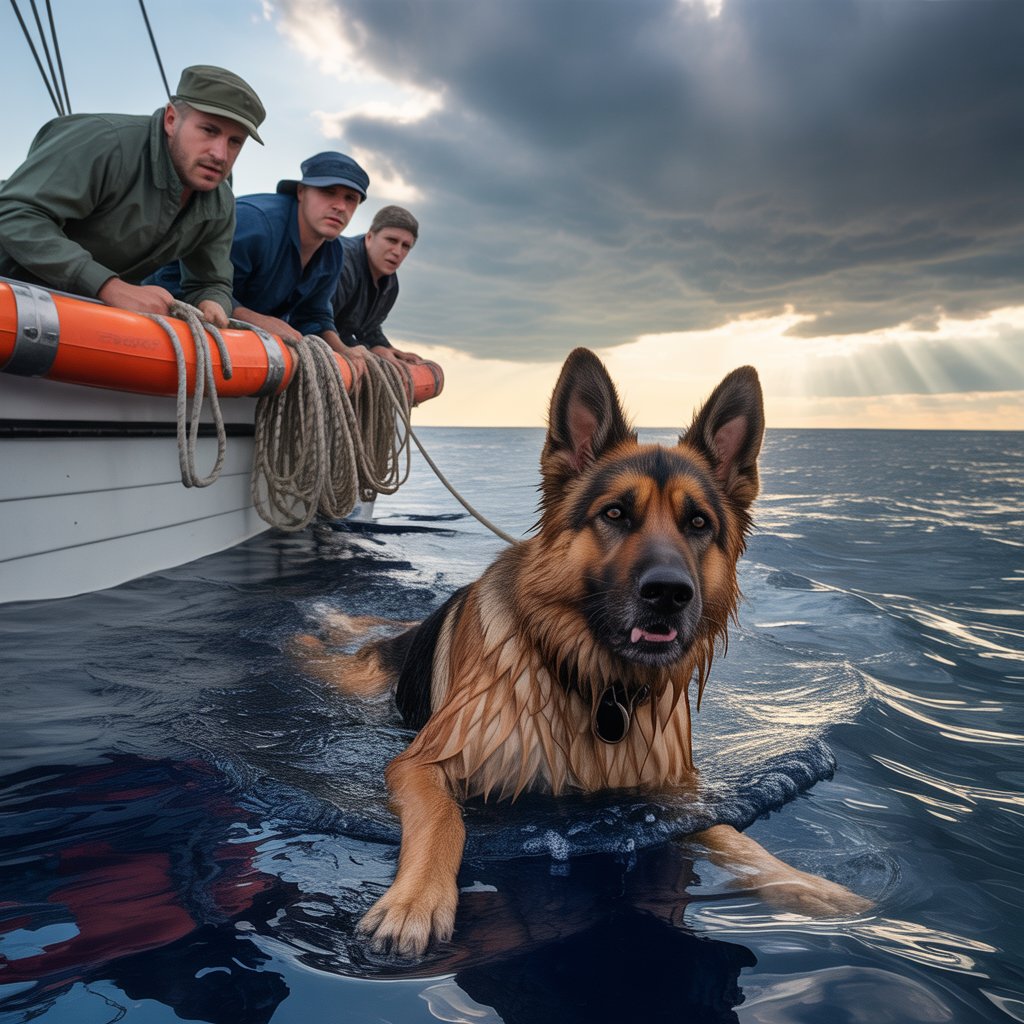 It was the afternoon watch, the sun a blistering white orb in the sky. The sea was a placid, shimmering sheet of glass, the kind that made you forget its teeth. It was one of the younger deckhands, a boy named Leo, who first saw it. “Captain!” he yelled, pointing to the horizon. “Is that… is that a dog?” Elias scoffed. “Impossible. You’ve been out here too long, son. Your eyes are playing tricks on you.” But as the ship drew closer, the impossible became undeniable. It was a dog, a large German Shepherd, paddling tirelessly. Her head was high, her gaze unwavering, and she was swimming with a ferocious resolve that defied her obvious exhaustion. She was a ghost of the land in a watery grave. It was a sight that made the entire crew stop. It was a moment that defied all reason, a tear in the fabric of the familiar, desolate ocean they knew.