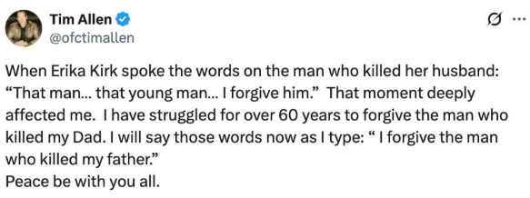 The phrase “I forgive the man who killed my father” immediately became an anthem of emotional survival. Fans and critics alike paused their feuds to acknowledge the depth of the moment. People shared their own stories of grief and rage, creating an unplanned, national online therapy session. Tim Allen’s post was no longer just a celebrity tweet; it was a catalyst for collective healing.