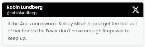 “Didn’t get to zoom questions tonight so i didn’t get to ask about it, but it felt like Vegas was more intentional about forcing Kelsey Mitchell ball screens down the sideline tonight compared to game 1,”Duncan tweeted. “Looking it up: Mitchell saw “ICE” coverage 5 times in G1, 10 times in G2.”