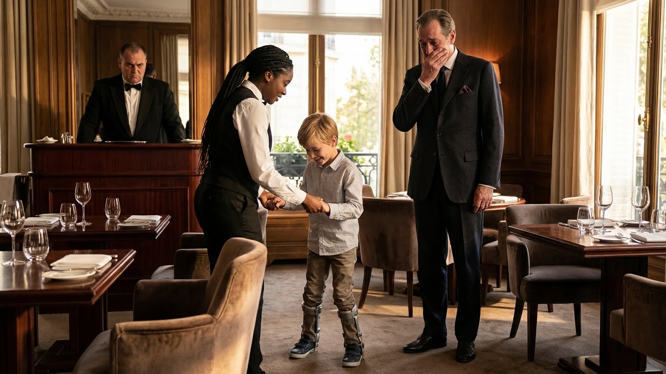 Léo, 10 ans, se tenait debout, tremblant, ses jambes vacillant sous le poids de lourdes attelles métalliques. Sa main, petite et hésitante, se tendait vers Aminata, la seule serveuse d’origine africaine de l’établissement ce soir-là. Le pianiste, sentant l’instant, entama une mélodie douce.