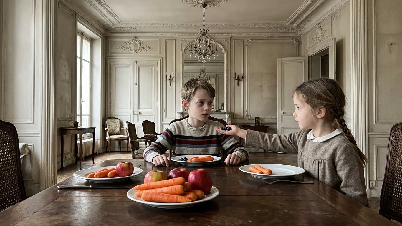 Le repas fut un supplice. Le chef avait préparé un menu traditionnel : Canard à l’orange et gratin dauphinois. Un cauchemar visuel pour Louis. De l’orange, du jaune, du doré. Devant Louis, Maria avait déposé son assiette spéciale : du chou rouge braisé, des pommes de terre violettes (Vitelotte) et du blanc de dinde. L’assiette jurait terriblement avec le reste de la table.