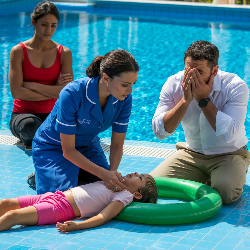 Guests stared, paralyzed. Arthur dropped his phone and crumpled to his knees, whispering, “My son… my son…” But the child was still, pale, water streaming from his mouth. Camila laid him on the hot marble and began compressions, her own tears mixing with the pool water on her face. “Please, God, not now, please…” she whispered.