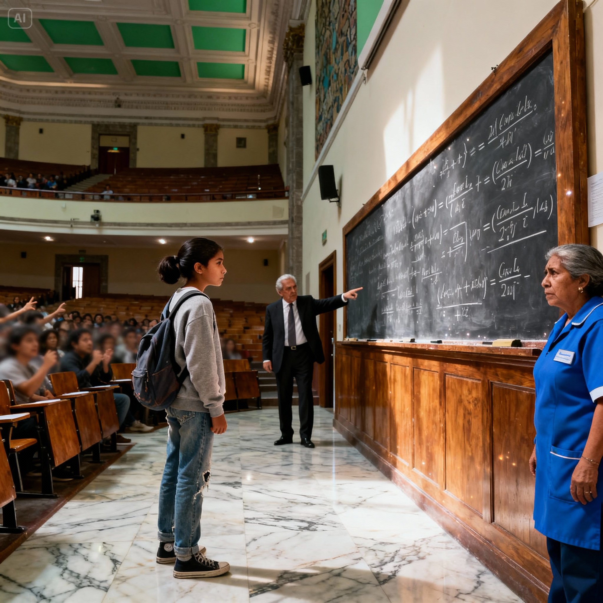 Todo huele a cera para pisos y a madera vieja. Es el olor de la UNAM, o al menos de este auditorio en la Facultad de Ciencias. Mi mamá, Doña Elena, dice que huele a oportunidades. Yo digo que huele a que no pertenecemos aquí.