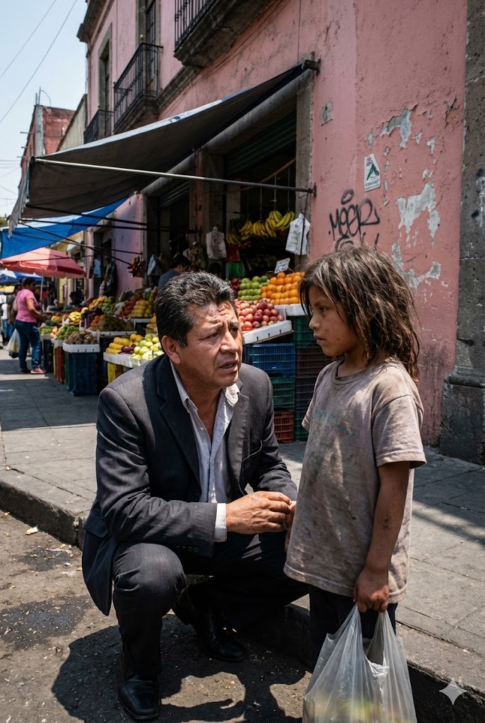 Era una niña. No tendría más de ocho años. Su vestido, alguna vez rosa, estaba gris de mugre y le quedaba dos tallas grande, colgando de sus hombros huesudos como un trapo olvidado. Tenía el cabello enmarañado, una maraña negra y revuelta que brillaba con el sudor. Sus zapatos eran tenis de lona rotos, con los dedos asomándose por los agujeros.