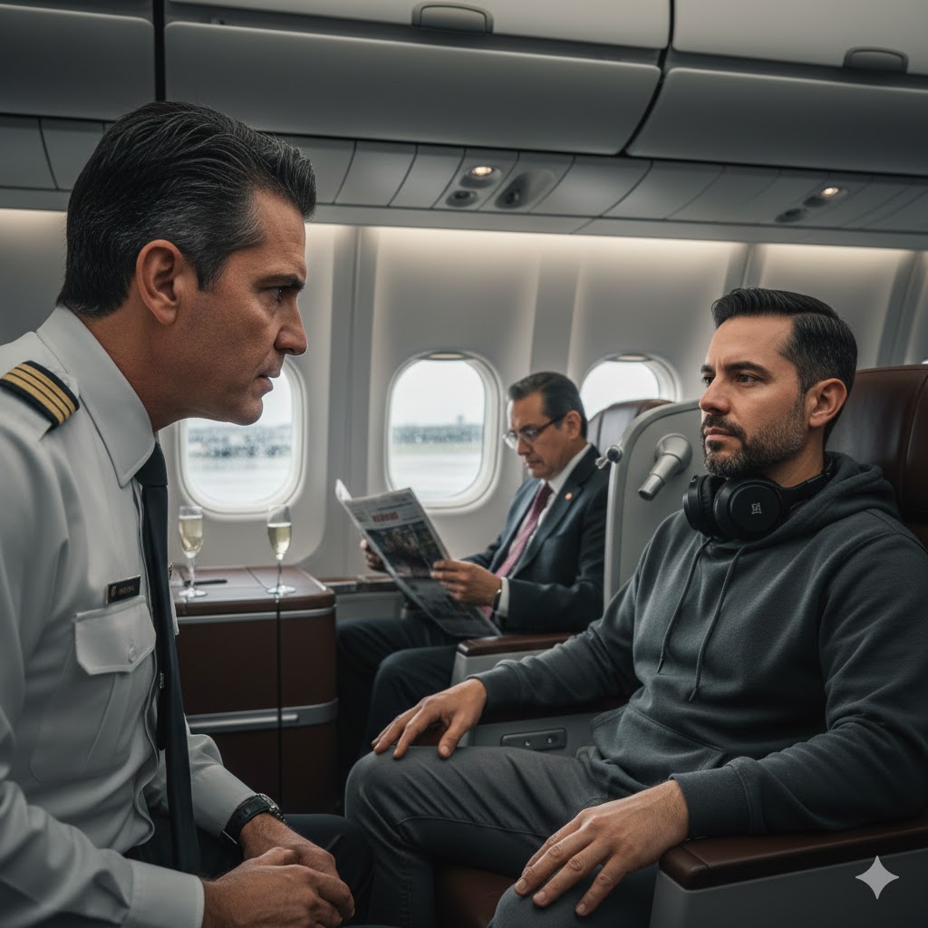 Ricardo llamó a Sara, la jefa de sobrecargos, quien ya conocía el temperamento explosivo del capitán. —¿Quién es ese en el 1A? —le siseó con la voz llena de veneno—. Parece perdido. Míralo: sudadera, pants… está incomodando al Senador.