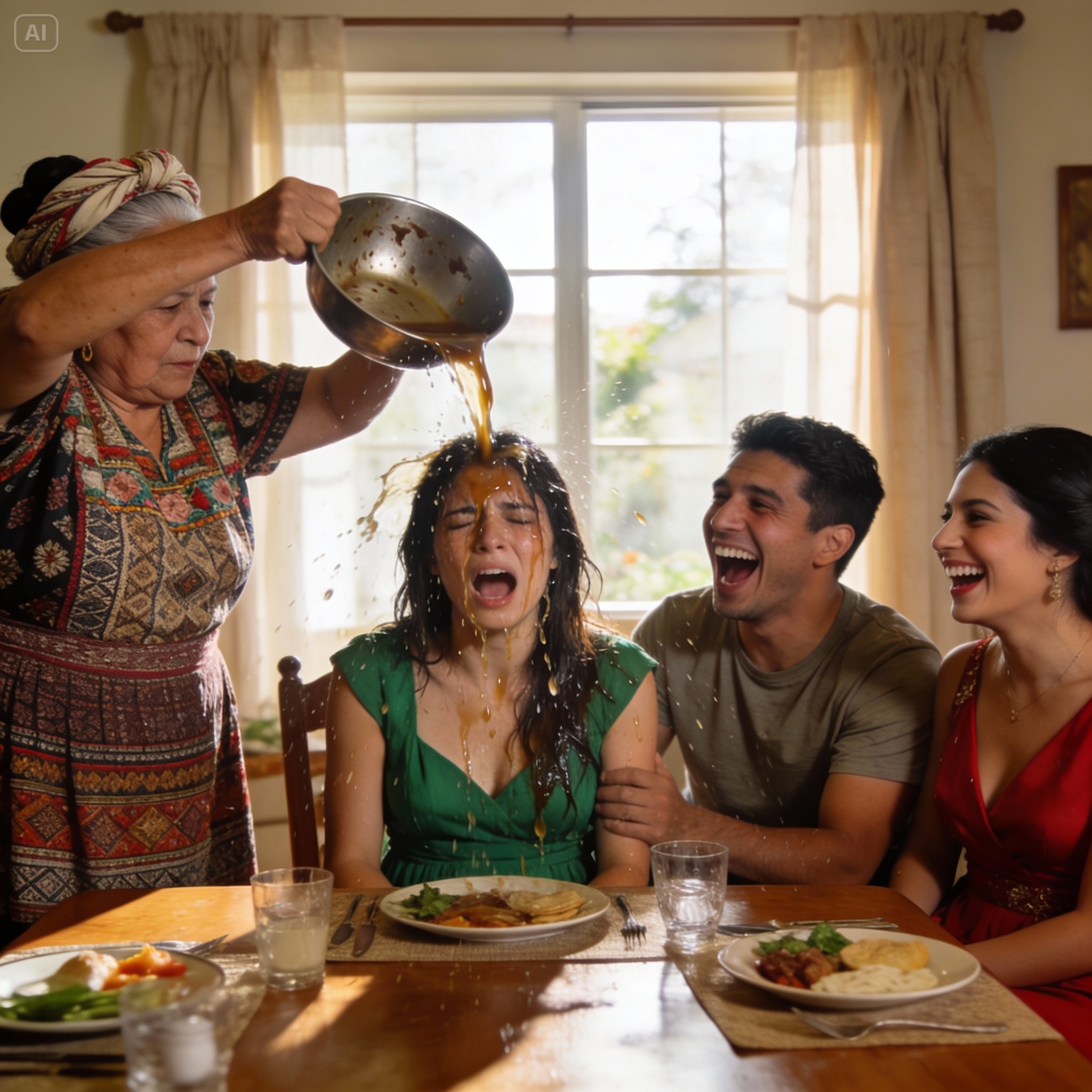 Antes de que pudiera reaccionar, inclinó la olla. El impacto del agua sucia sobre mi cabeza me dejó sin aliento. Sentí el olor a grasa y vegetales viejos empapando mi vestido. El agua escurría por mi cara, nublándome la vista. Una cáscara de papa quedó atrapada en mi hombro.