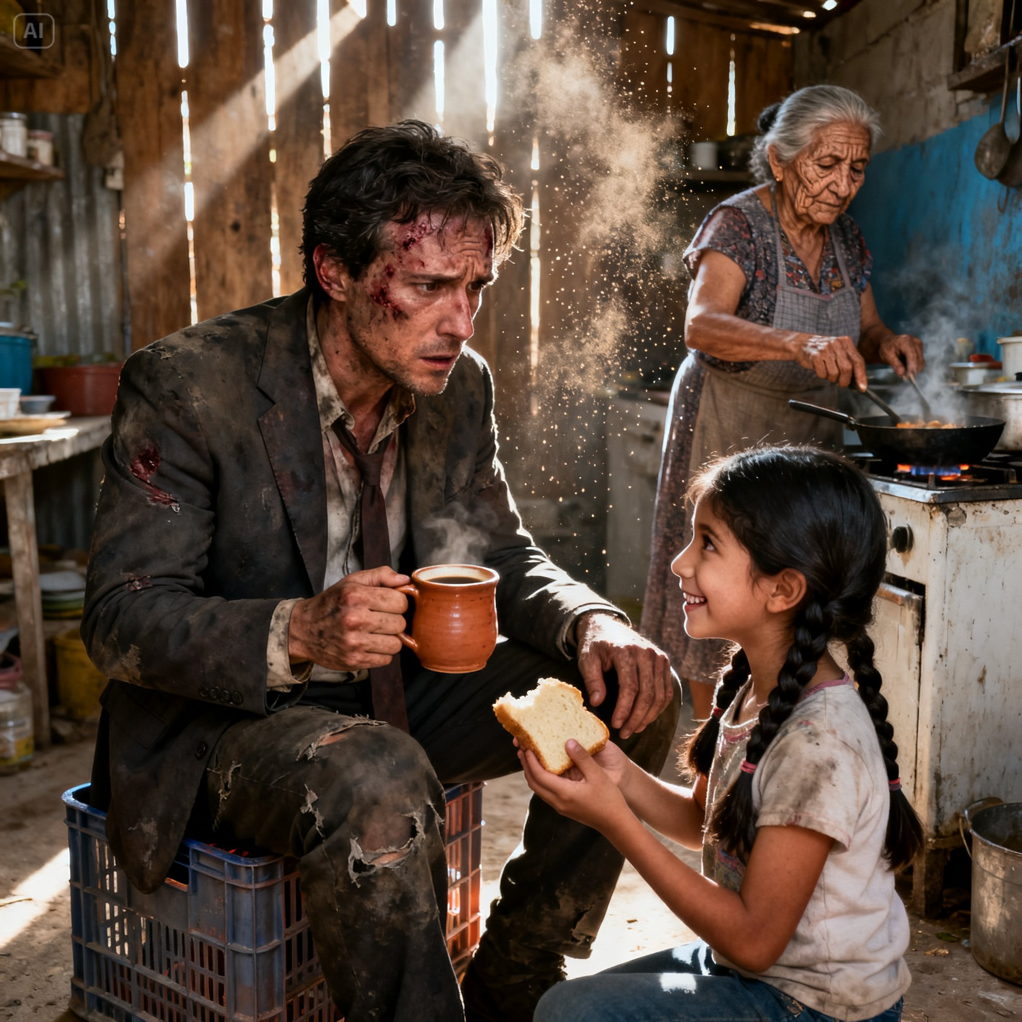 —”Mire, Mateo”— empezó Rosa, dejando su taza de café sobre la mesa y mirándolo fijamente a los ojos. Su mirada era dura, pero honesta. —”Vamos a hablar claro, porque aquí no nos andamos con rodeos. Anoche te dimos asilo porque no somos animales para dejarte tirado. Pero la situación está canija. Valeria y yo vivimos al día. Lo que pepenamos hoy, nos lo comemos mañana”.