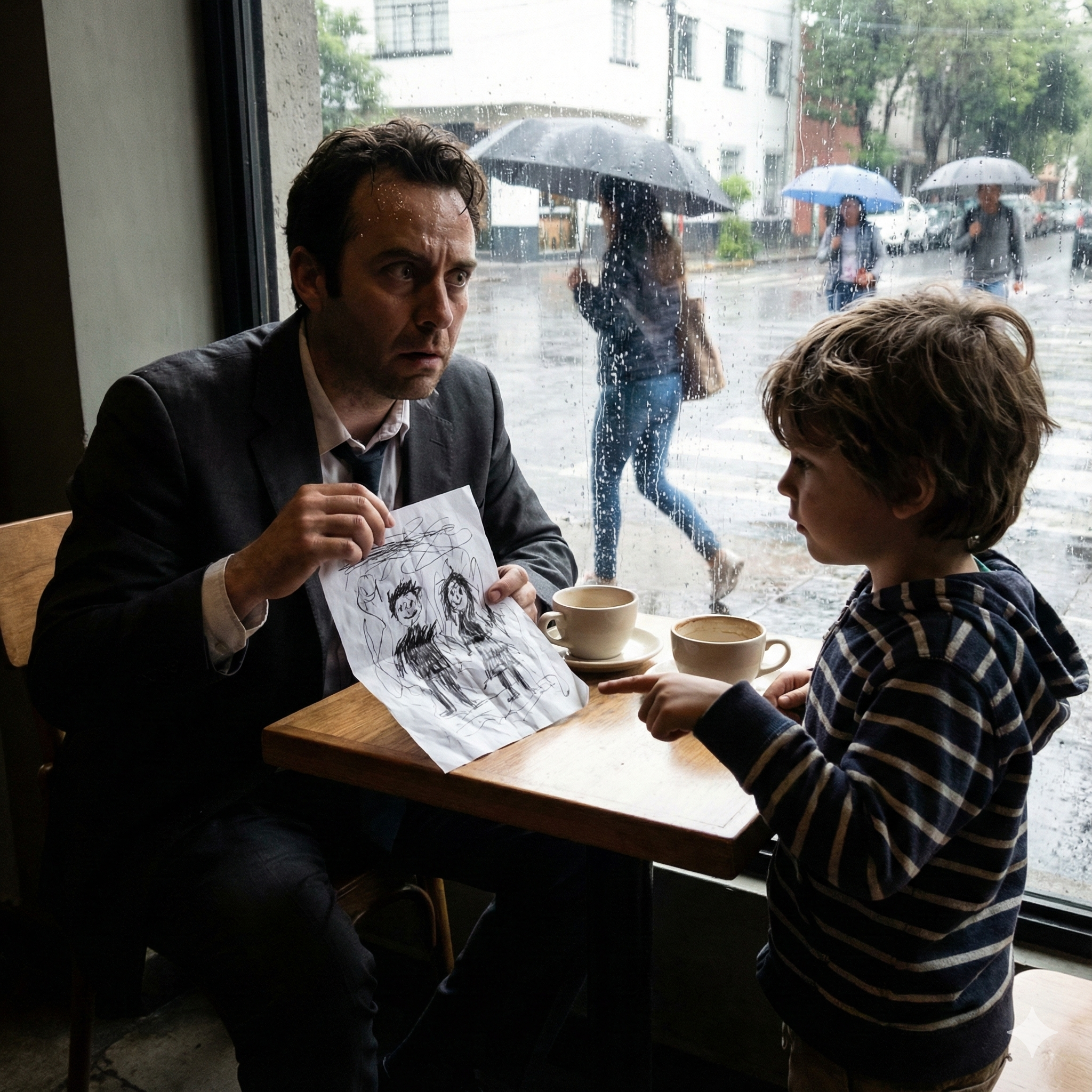 En la mesa, el vapor del café creaba una cortina entre ellos. Javier miraba alternativamente el dibujo de Alvarito y el rostro asustado de María.