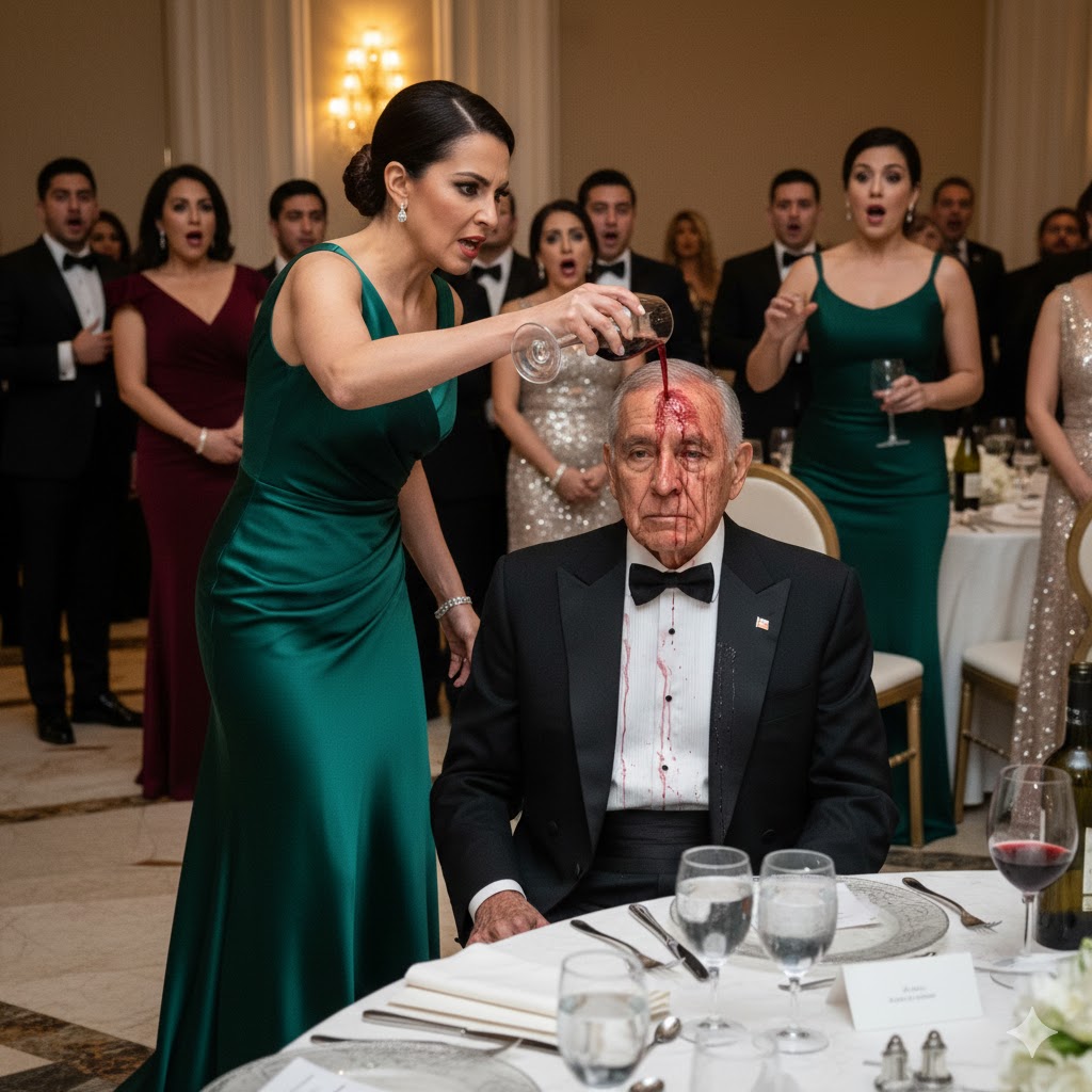 En un movimiento deliberado, Victoria inclinó la copa. El Cabernet tinto cayó en un arco perfecto sobre la cabeza de Damon Richardson. El líquido empapó su cabello, corrió por su rostro y manchó su impecable traje azul marino. El vino salpicó el mantel blanco como si fuera sangre derramada.