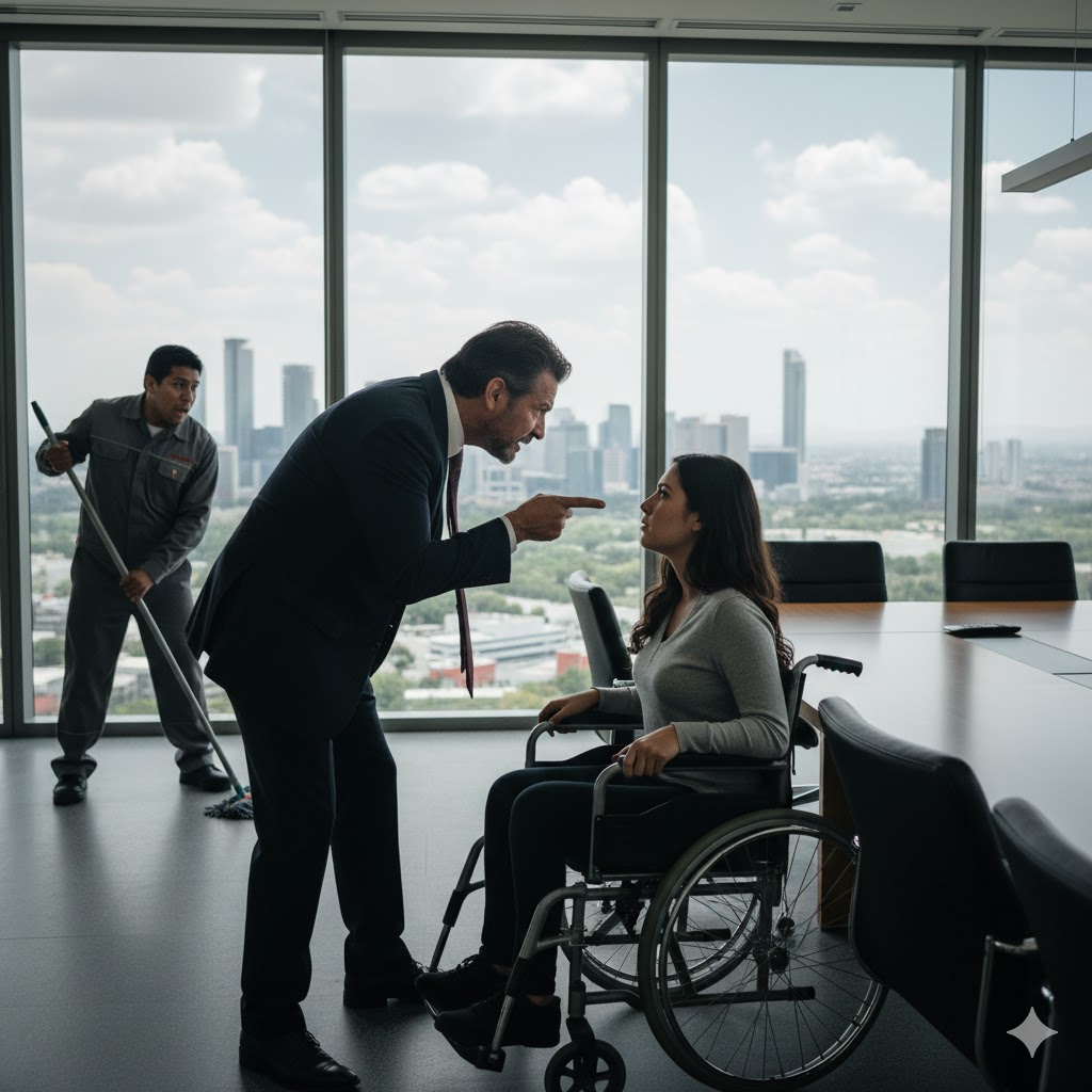 —¿Ebrio? ¡Estoy lúcido! —rugió él, acercándose peligrosamente—. Mírenla. Ni siquiera se puede levantar para brindar con nosotros. ¿Qué sigue? ¿Vamos a poner una rampa para que la empresa no se caiga? ¡Jajaja!