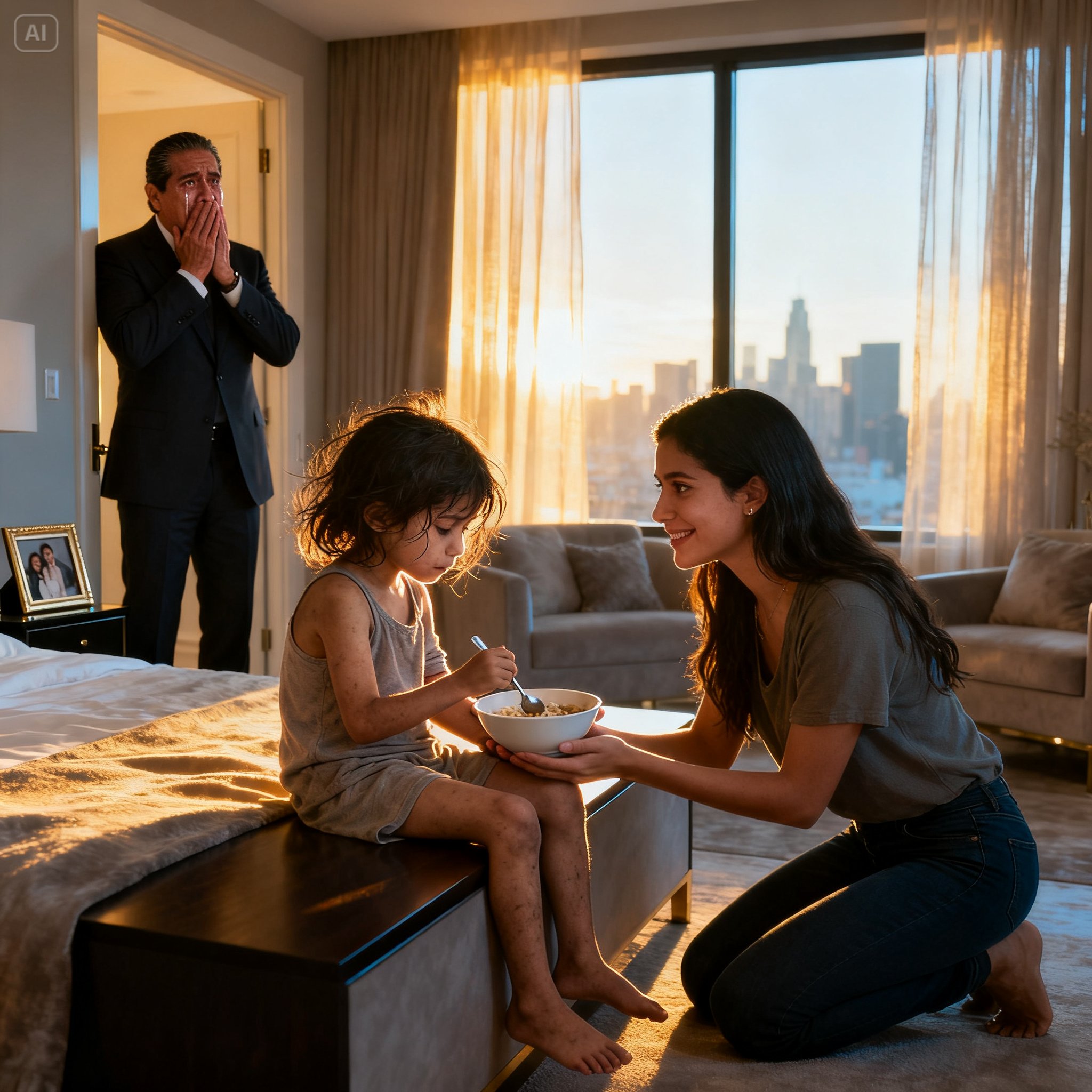 Diego Olvera estaba de pie en el marco de la puerta de caoba, sintiendo que el aire le faltaba. Su mirada estaba fija en el pequeño cuerpo de su hija, Sofía, quien yacía sobre la alfombra de seda de su habitación en un exclusivo penthouse de Santa Fe. La niña, que alguna vez fue un torbellino de risas y juegos, ahora parecía una muñeca de porcelana a punto de romperse. Llevaba quince días sin probar alimento, rechazando desde los manjares más caros hasta los suplementos nutricionales que los mejores médicos de México habían prescrito.