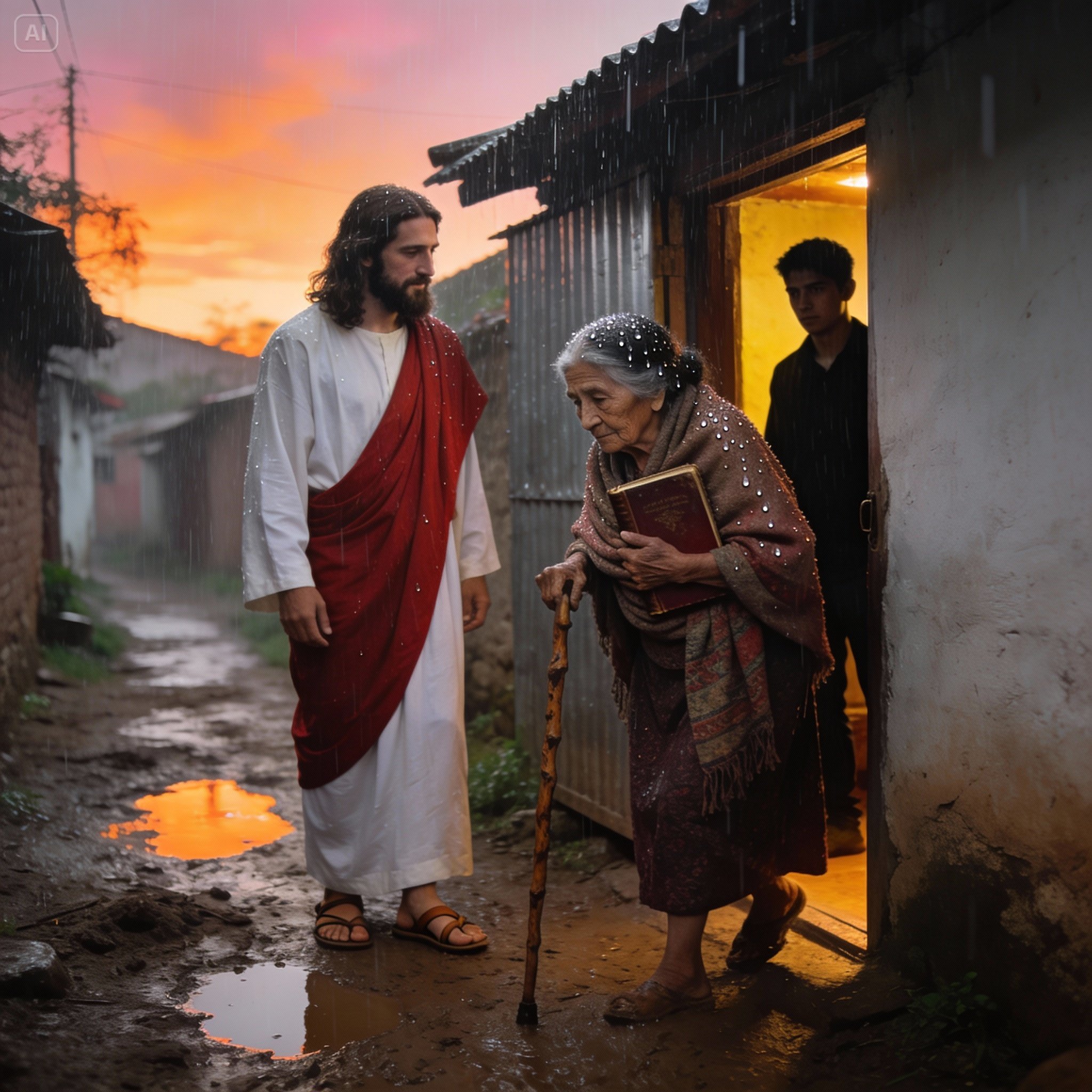 Fue entonces cuando sucedió lo imposible. En medio de la oscuridad y la tormenta, unos pasos tranquilos resonaron en el cemento. Teresa levantó la vista y vio a un hombre alto, vestido con un poncho de lana oscura y sandalias de cuero, como si la lluvia no pudiera tocarlo. Él se sentó a su lado con una paz que desafiaba a la tormenta y la miró con unos ojos que ella describió después como un océano de compasión infinita.