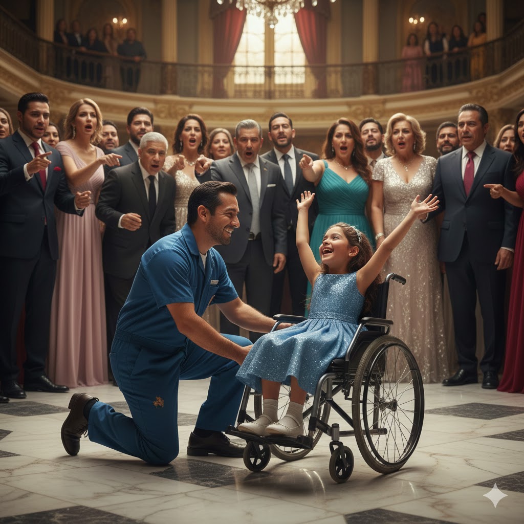 La música volvió a sonar, pero esta vez era una melodía dulce y esperanzadora. Ahí estábamos los tres: yo, el ingeniero convertido en conserje, empujando suavemente la silla de Emily, mientras Lily sostenía su mano y saltaba a nuestro alrededor. Fue una imagen que rompió el internet pocas horas después.