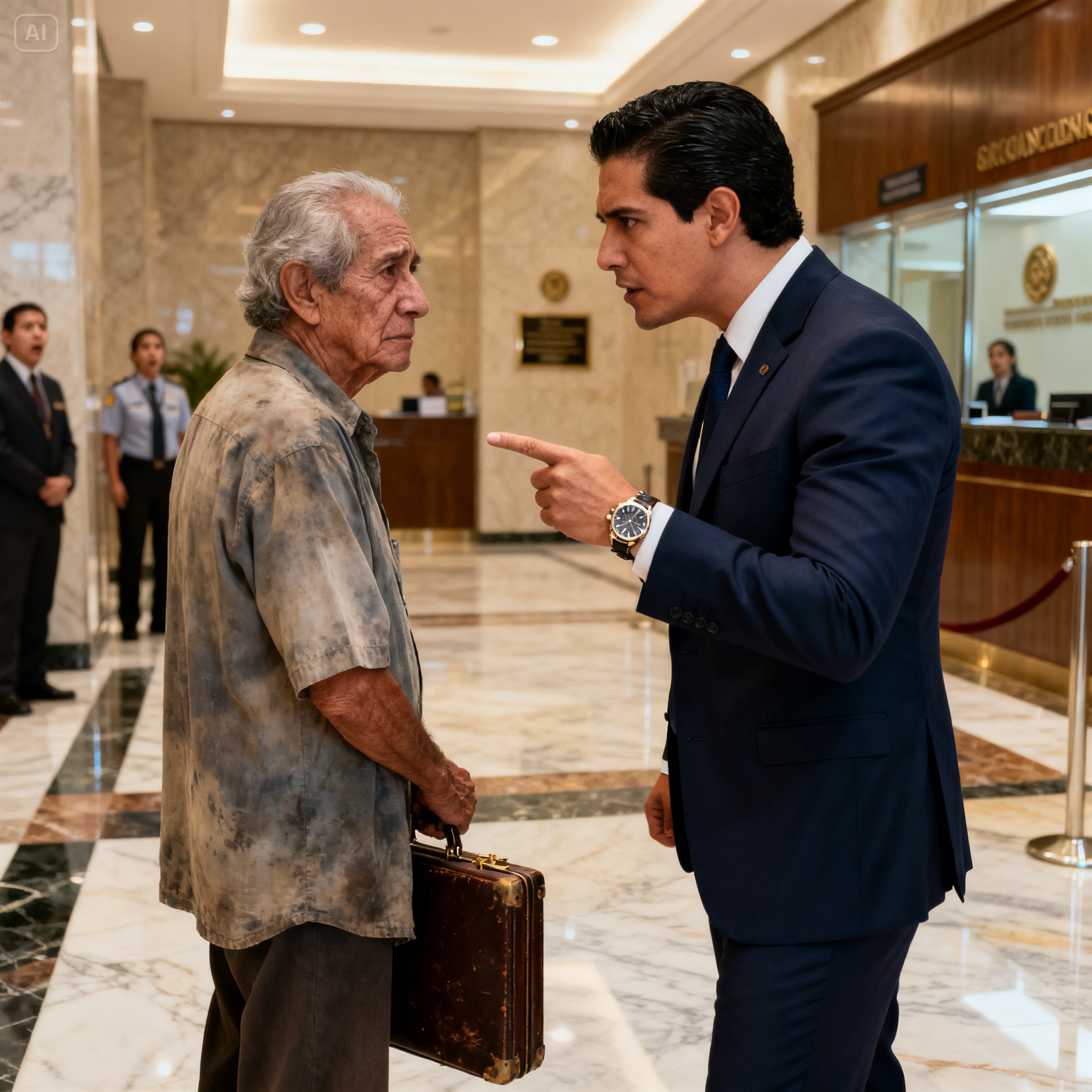 El silencio que siguió fue absoluto, casi religioso, roto únicamente por el zumbido distante de las máquinas de café expreso y el murmullo casi imperceptible del aire acondicionado central. En ese vasto templo de mármol y cristal, más de treinta personas —ejecutivos, secretarias, clientes distinguidos y personal de seguridad— contenían la respiración, esperando ver cómo el anciano se desmoronaba. Esperaban lágrimas, súplicas, o quizás ese temblor patético de la vergüenza que suele acompañar a la humillación pública.