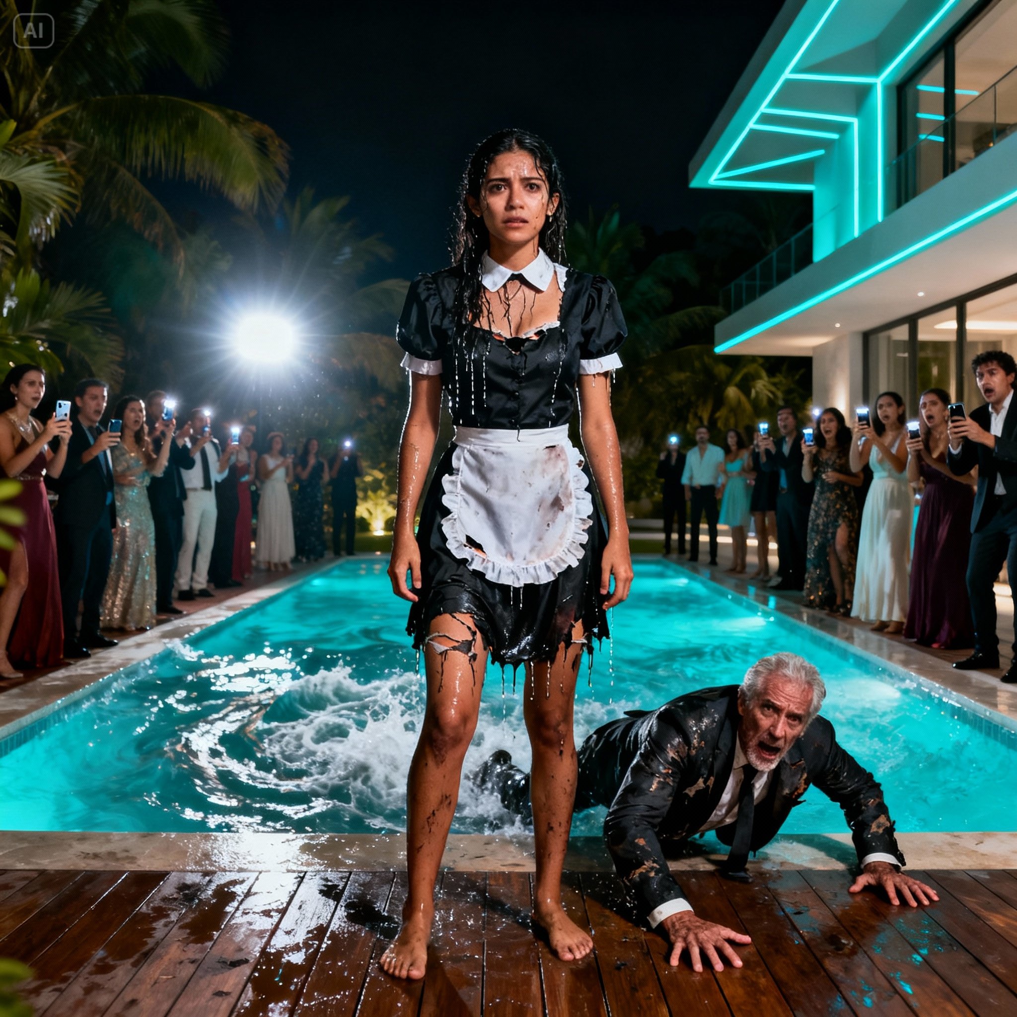 El impacto con el agua fue un estallido de ruido blanco y burbujas. El frío me golpeó como un puñetazo físico, expulsando el aire de mis pulmones en un grito ahogado. Me hundí rápidamente, el peso de mi uniforme y mis zapatos de trabajo actuando como anclas, arrastrándome hacia el fondo de mármol azul.
