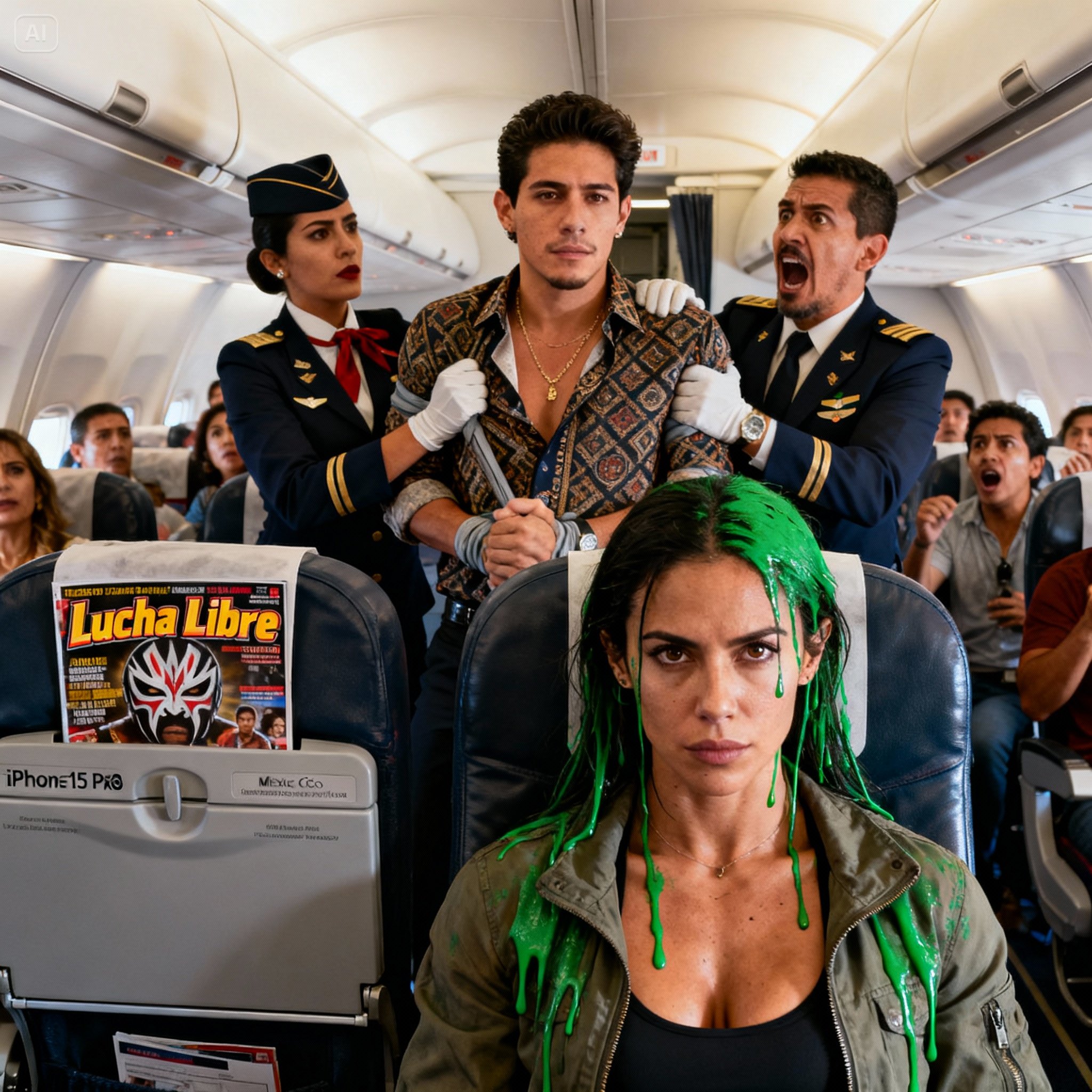 —”¡Esto es un secuestro! —gritó Santiago de repente, su voz quebrándose en un gallo agudo—. ¡Me están reteniendo contra mi voluntad! ¡Azafata, quítame estas madres ahorita! ¡Te juro por mi vida que mi papá va a comprar esta aerolínea mañana solo para correrte a ti y a toda tu familia de nacos!”.