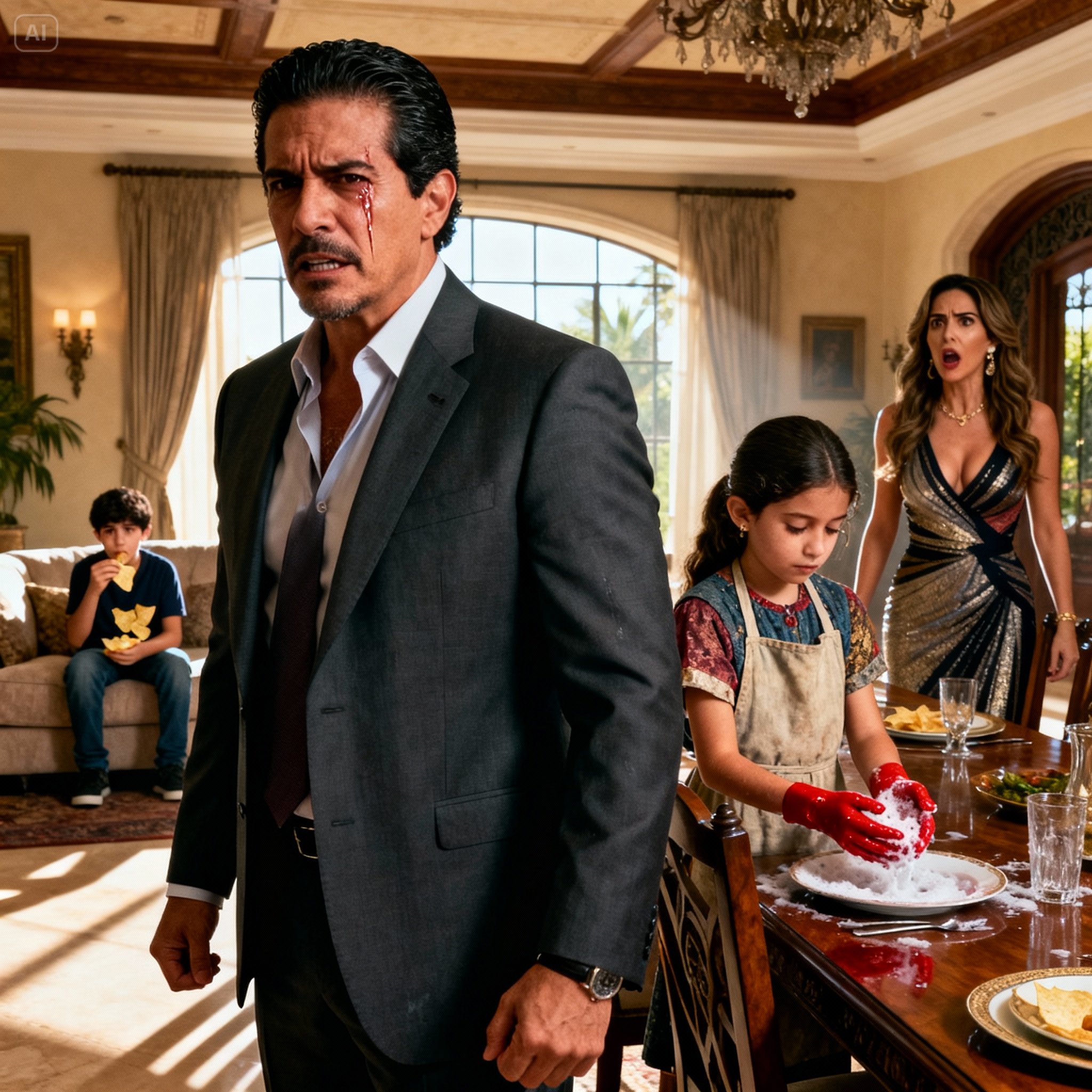 Mientras en la sala se escuchaban risas, música suave y el tintineo de copas de champagne, Marina estaba frente al fregadero industrial de la cocina. La pila de platos era inmensa. Sus manitas, acostumbradas a sostener muñecas y lápices de colores, ahora estaban rojas, hinchadas por el detergente fuerte y el agua caliente.