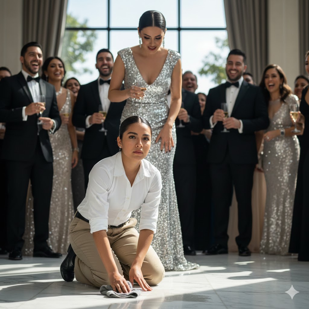 Sentí cómo el calor subía por mi cuello, pero mi madre siempre decía que la verdadera fuerza se muestra en el silencio. Me arrodillé. Mis pantalones se arrugaron contra el suelo frío mientras tomaba el paño húmedo. El salón estalló en risas. Los flashes de los celulares comenzaron a brillar; estaban documentando mi “humillación” para sus historias de Instagram.