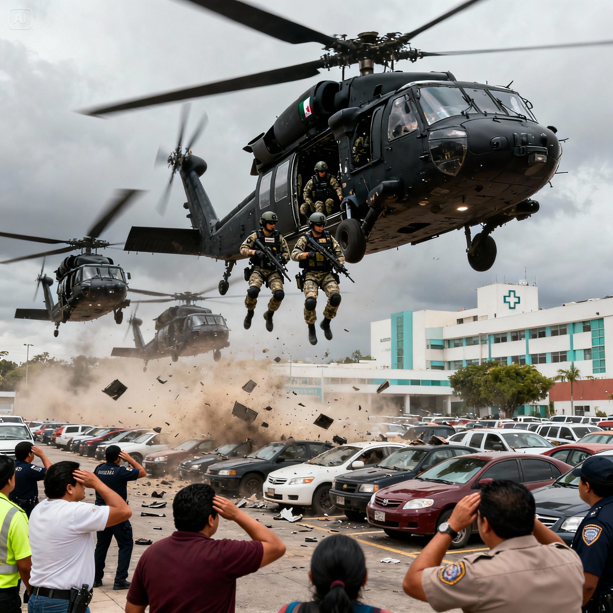 Pero era imposible ignorarlo. El rugido era ensordecedor ahora. El primer helicóptero, un UH-60 Blackhawk sin más marcas que la matrícula gris de la SEMAR (Secretaría de Marina), hizo una maniobra agresiva sobre las filas de autos estacionados. La ráfaga de aire de los rotores envió un Tsuru compacto derrapando hacia un lado.