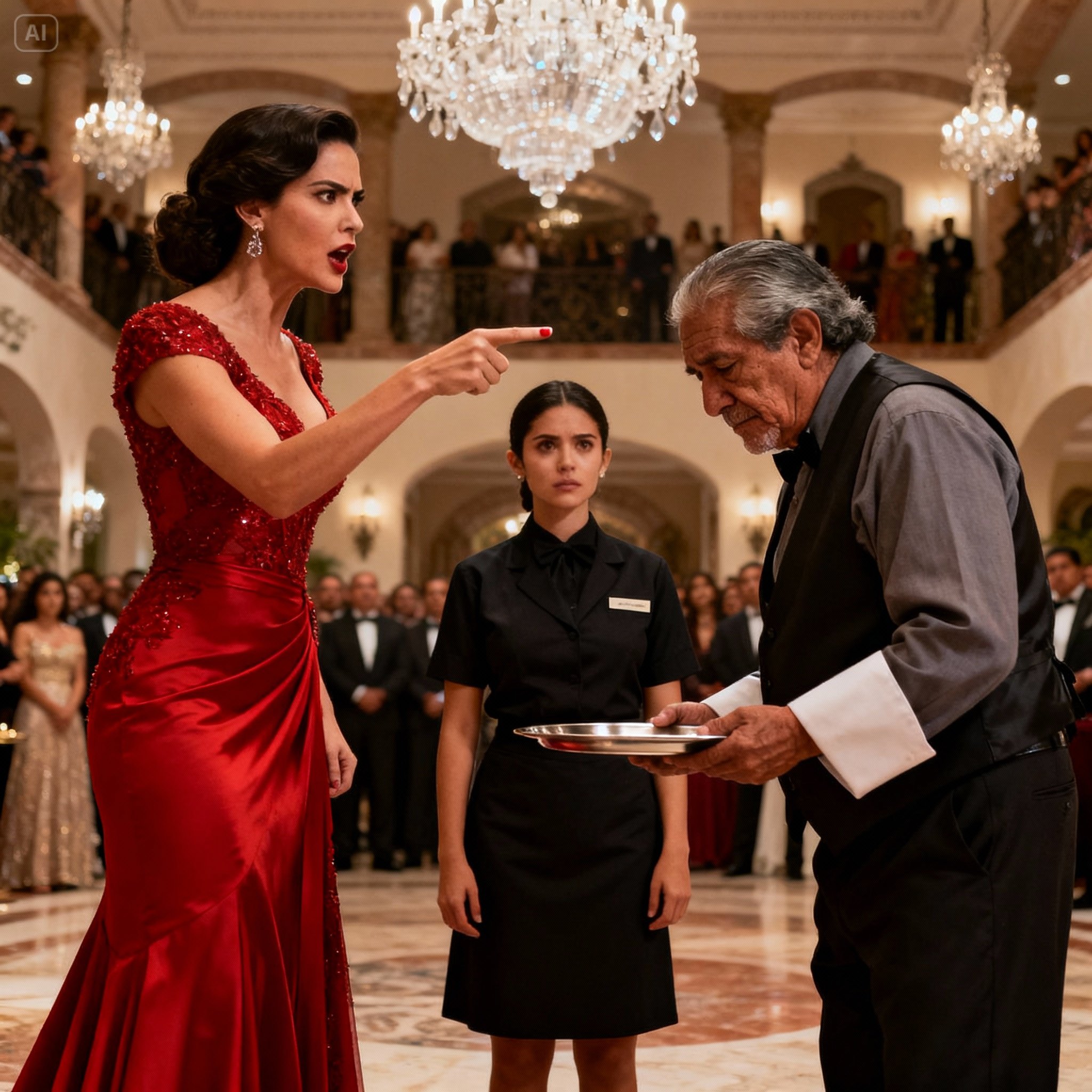 Justo en el centro de la pista, bajo el brillo de candelabros de cristal que costaban más que una casa promedio, Camila Astudillo, la prometida del hombre más poderoso de todo el norte de México, levantó un dedo perfectamente manicurado y lo apuntó como un arma cargada hacia el rostro de Don Enrique.