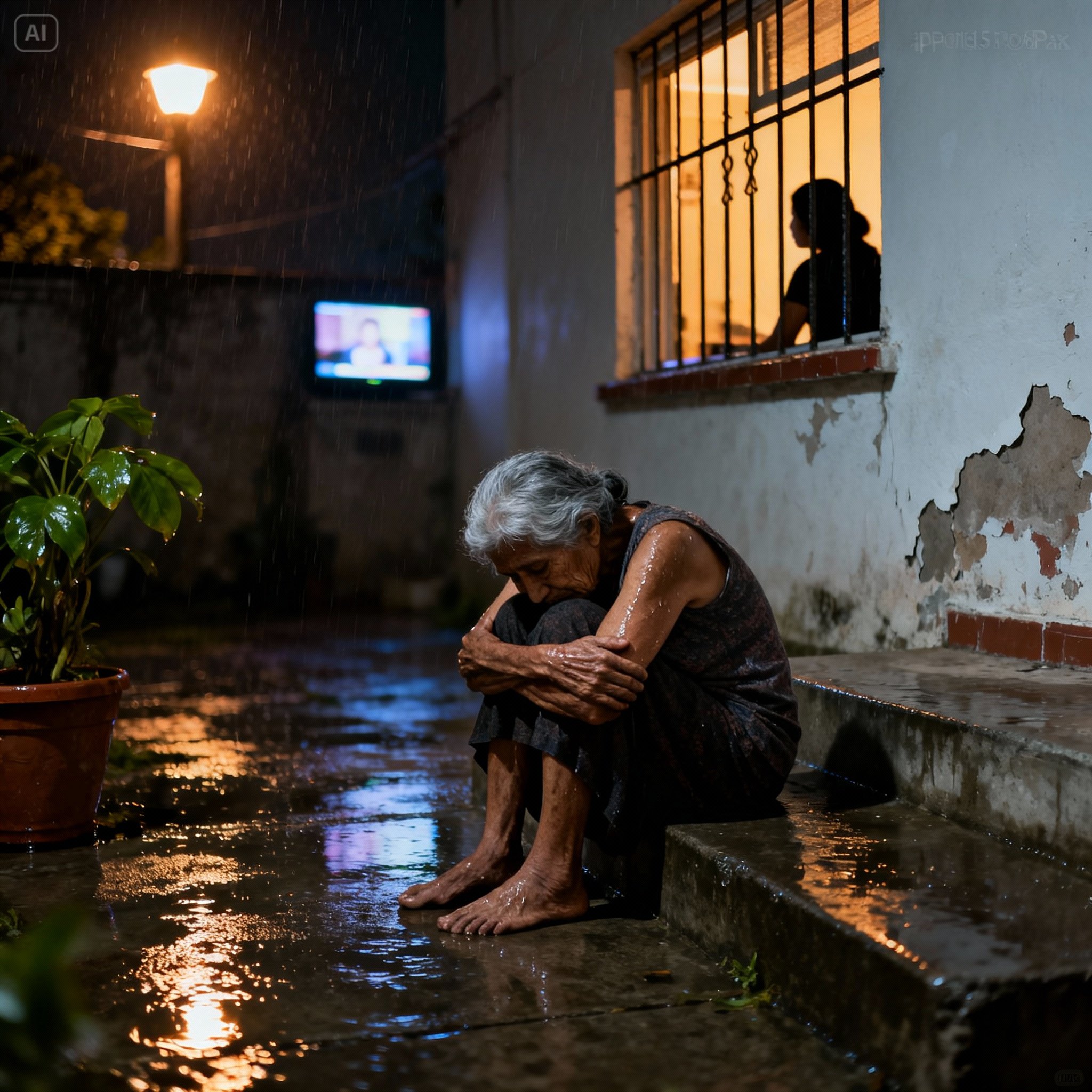 La anciana estaba sentada sobre un escalón de concreto, tiritando violentamente. Su cabello gris, ese que siempre llevaba recogido en un chongo impecable, ahora se pegaba a su cráneo, escurriendo gotas sucias por su rostro arrugado. Abrazaba sus propios brazos delgados, tratando inútilmente de conservar un poco de calor corporal, mientras los truenos hacían vibrar los vidrios de las casas vecinas.