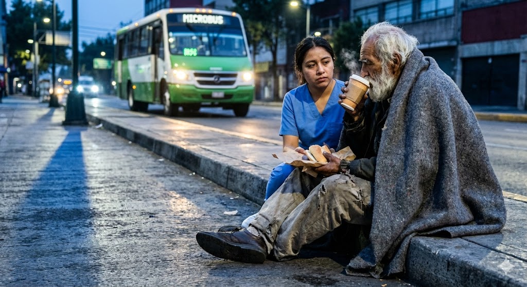 Siempre en el mismo lugar, sobre un cartón aplanado de refrigerador, envuelto en una cobija de lana que alguna vez debió ser gris pero ahora era del color del asfalto. Tenía 68 años, la barba blanca y desaliñada, y la piel curtida por el sol y el smog de la ciudad. Para el resto del mundo, Don Jorge era invisible. La gente pasaba a su lado acelerando el paso, cruzaban la calle para no olerlo, o simplemente fingían que ese bulto de ropa vieja no era un ser humano.