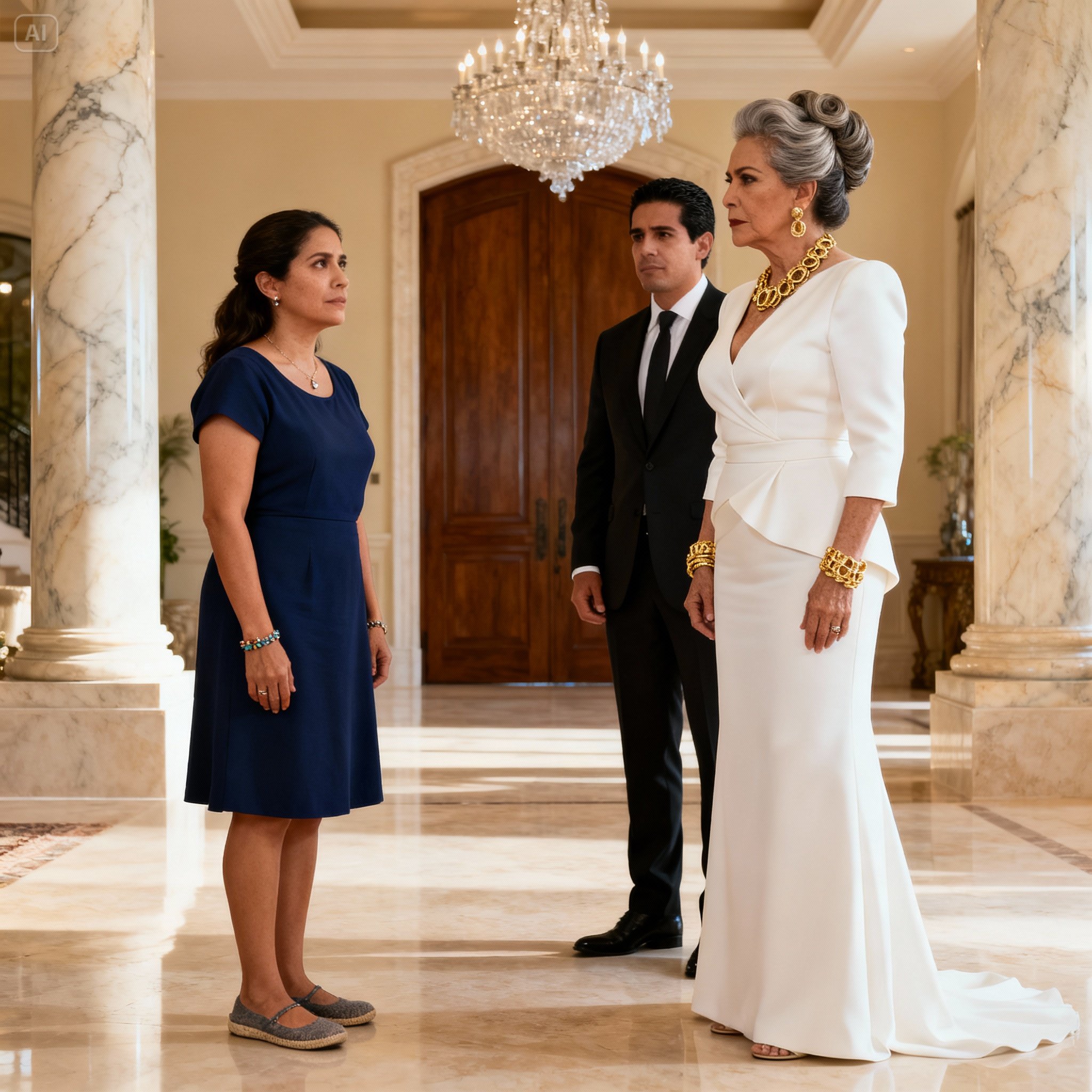 Patricia Villaseñor estaba parada en el vestíbulo como una generala pasando revista a sus tropas, aunque su “ejército” consistía en un equipo de limpieza aterrorizado y, ahora, yo. Su rostro se torció en una mueca que intentaba ser una sonrisa, pero se parecía más a la expresión de alguien que acaba de oler leche agria. Sus ojos, delineados con precisión quirúrgica, viajaron por mi vestido azul marino de tienda departamental, bajaron a mis medias sencillas y terminaron en mis zapatos.