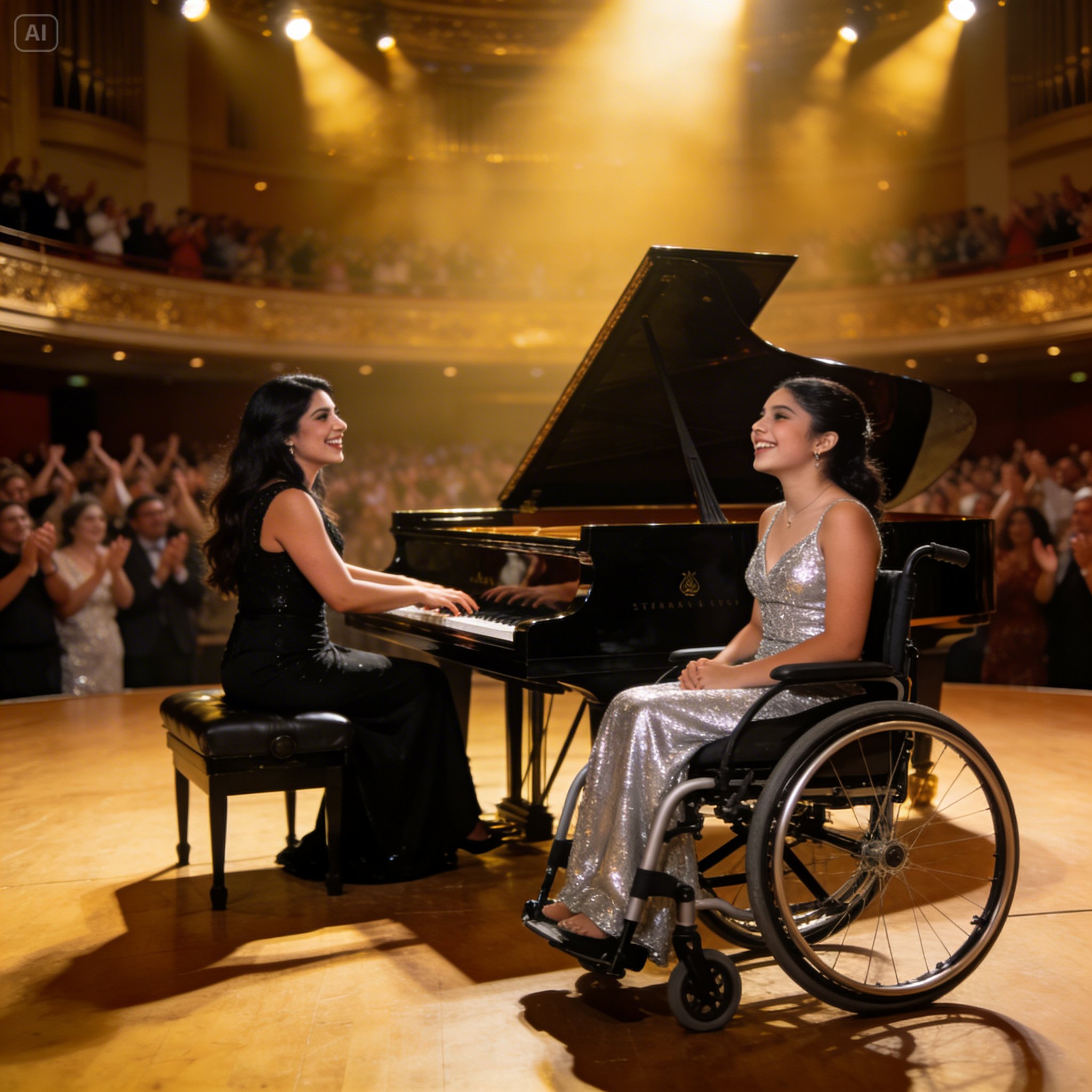 Entramos al escenario. Yo caminaba detrás de Elisa, empujando suavemente su silla hasta colocarla frente al gran Steinway negro, el mismo que había sido testigo de mis lágrimas meses atrás. Pero hoy, el piano no daba miedo. Hoy, el piano nos esperaba como un viejo amigo.