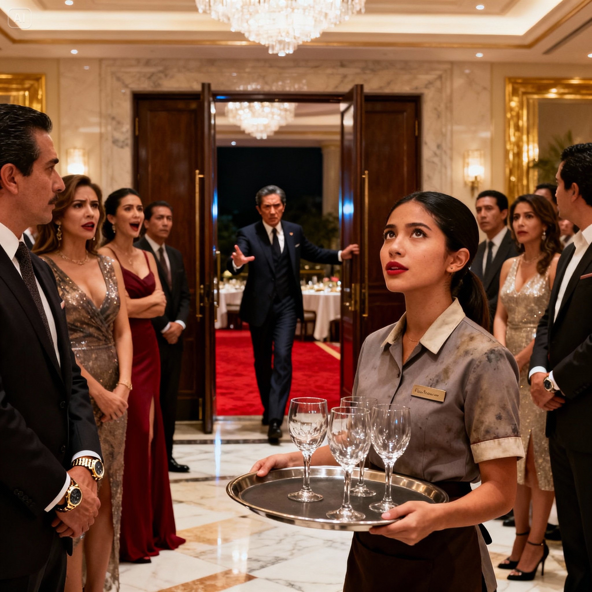 Sofía, la mujer del vestido rojo que minutos antes se había burlado de la “arruga” en mi uniforme, soltó una risa nerviosa. Fue un sonido agudo, quebradizo, como cristal pisado. Dio un paso adelante, sus tacones de suela roja golpeando la alfombra con una autoridad que ya no poseía, aunque ella aún no lo sabía.