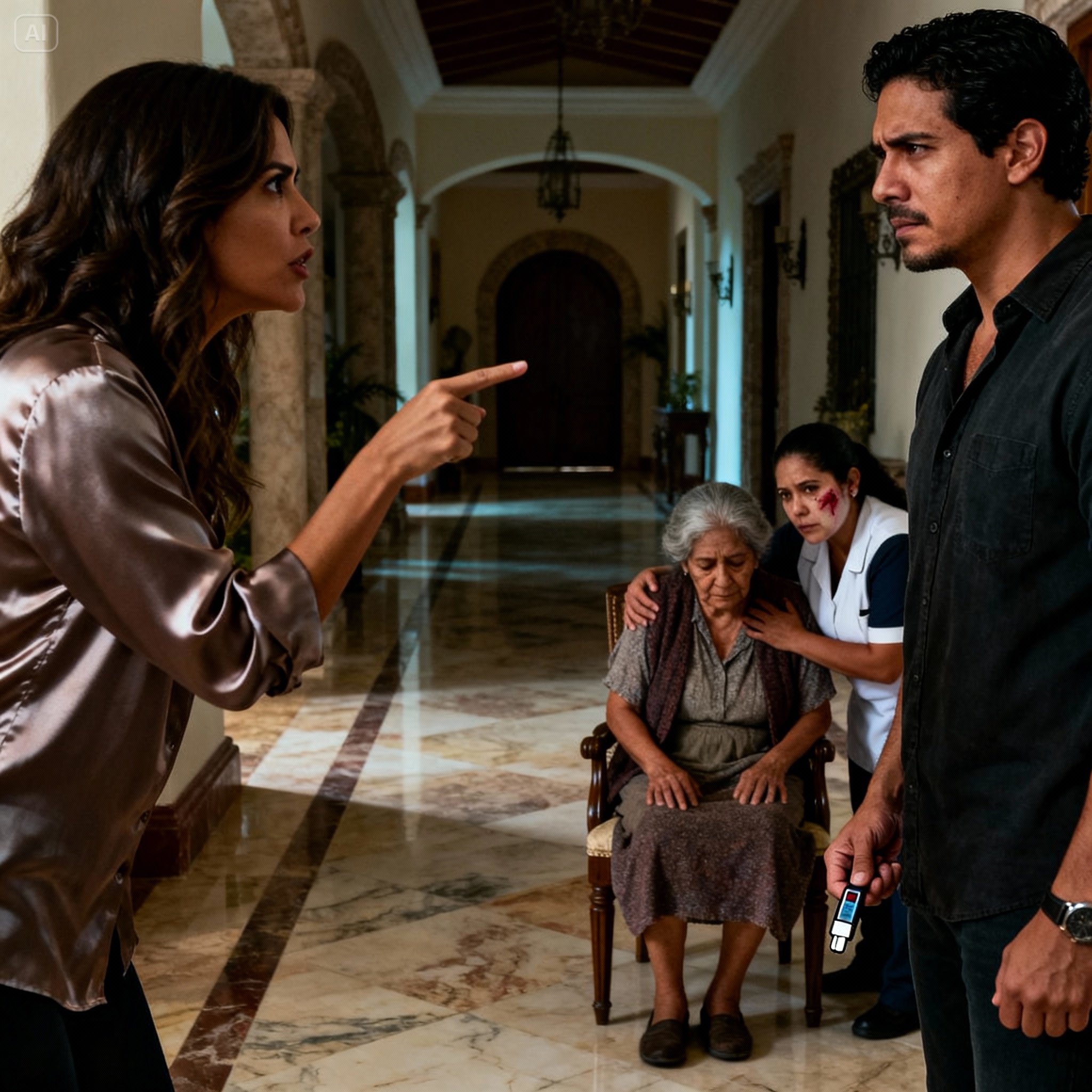 Rosita se levantó como pudo, con la sangre escurriendo por su cara. —Patrón… Don Ricardo… —dijo ella, sacando algo de la bolsa de su delantal—. No es culpa de su mami. Ni mía. Perdone que se lo dé así, pero ya no aguanto más.