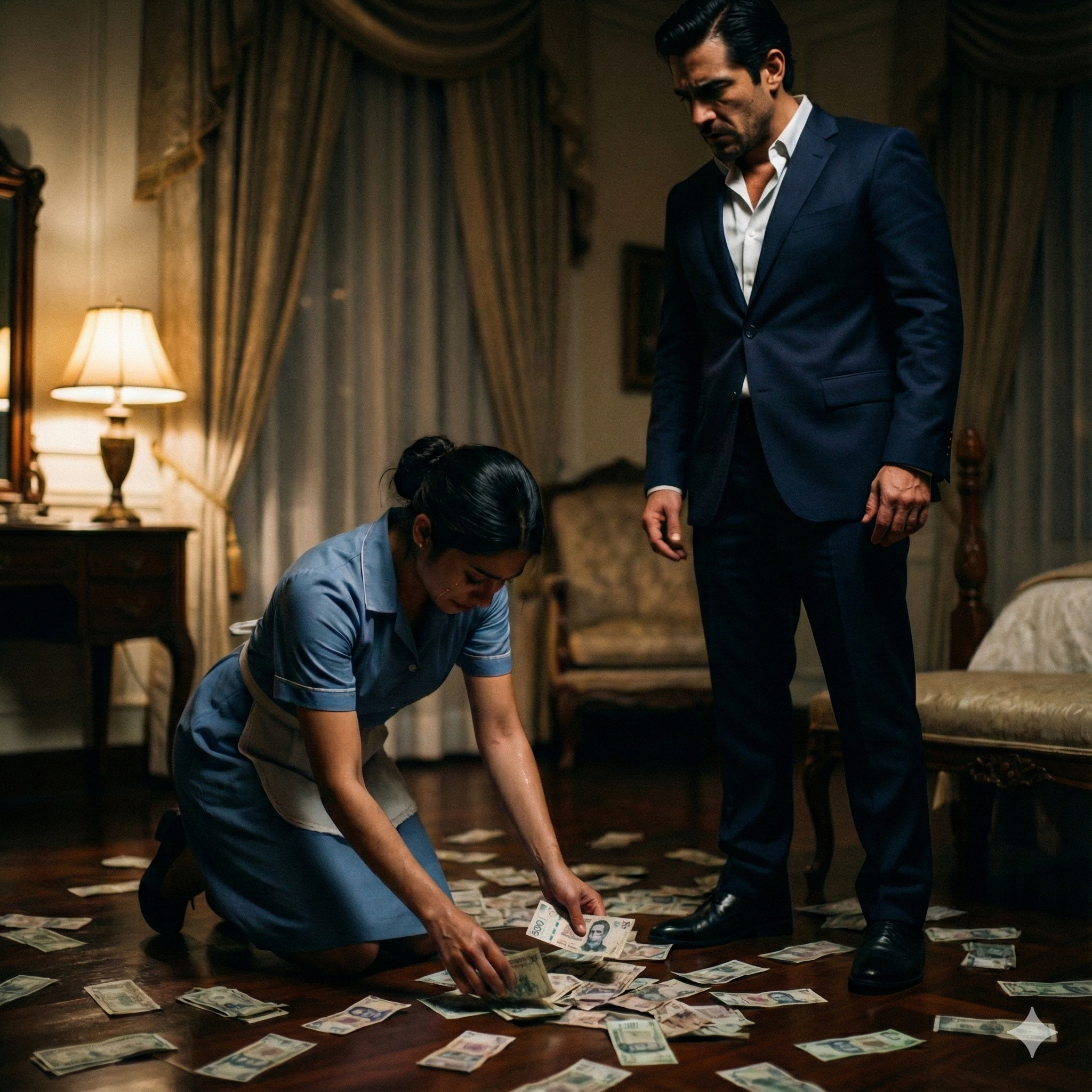 Sebastián permaneció inmóvil, su figura alta proyectando una sombra larga sobre la chica arrodillada. La escena era grotesca y surrealista. Afuera, las luces de la Ciudad de México brillaban indiferentes; adentro, en una de las casas más exclusivas del país, una joven recogía una fortuna del suelo mientras temblaba como una hoja.