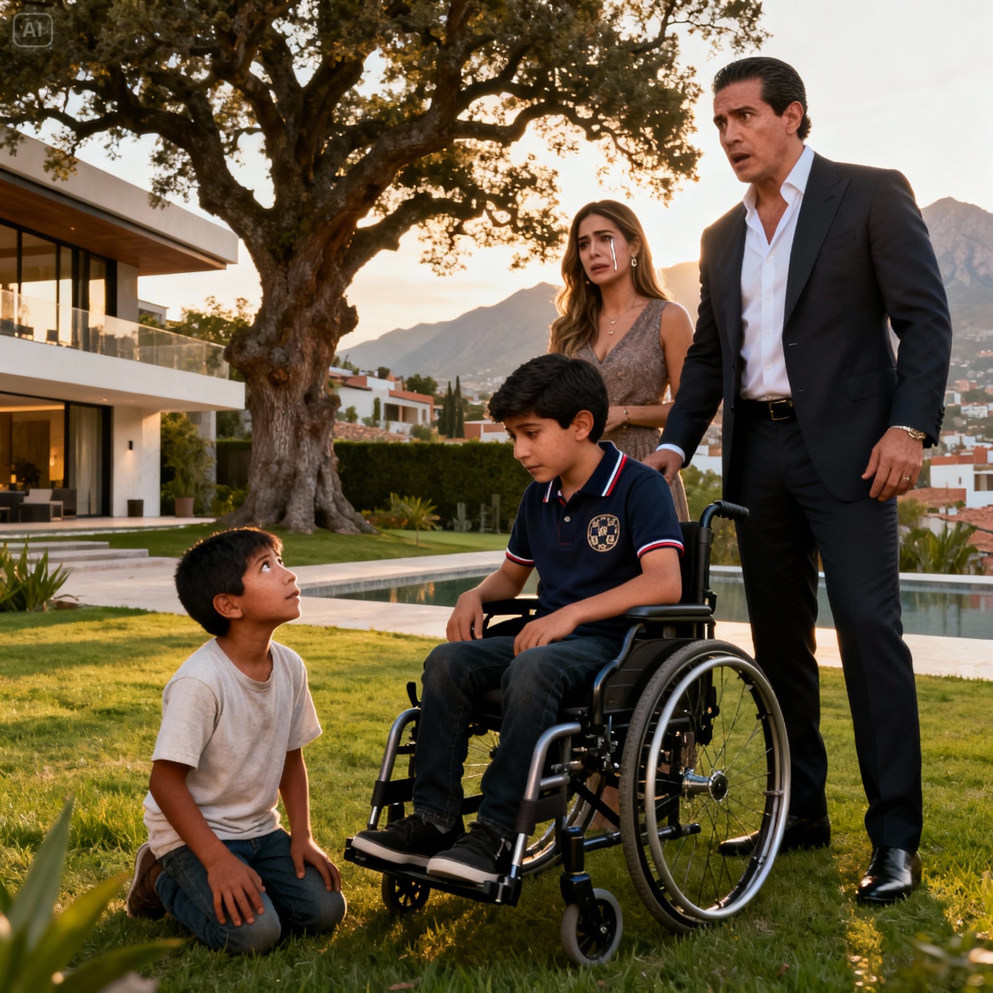 El niño caminó con una seguridad asombrosa hacia la zona de la alberca, donde Mateo, el hijo de Ricardo, estaba sentado en su silla de ruedas. Mateo, de apenas ocho años, era una sombra de lo que fue. Sus ojos azules, antes llenos de la chispa de quien quiere comerse el mundo, ahora estaban fijos en el suelo, vacíos. Desde aquel accidente en el encino centenario del jardín, la alegría se había mudado de esa casa.
